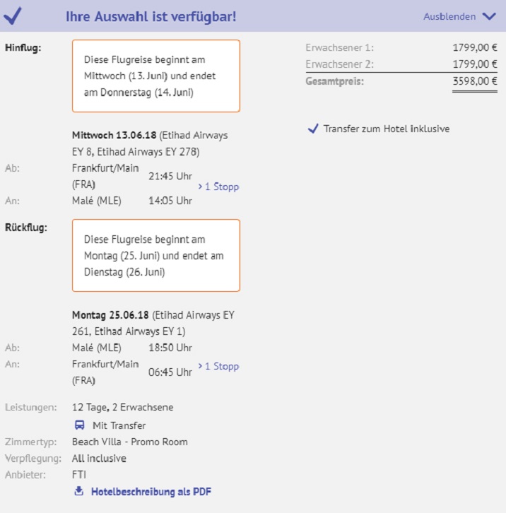 Sollten das angegebene Datum und/oder der Flughafen nicht deinem Wunsch entsprechen, kannst du gerne auf unseren grün hinterlegten „Deal individualisieren“ Button klicken und die Reisedaten entsprechend anpassen.