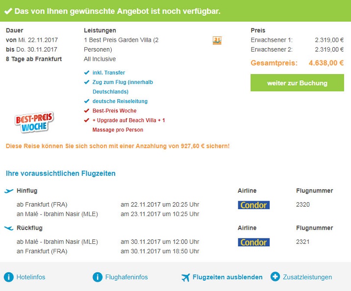 Sollte das angegebene Datum und/oder der Flughafen in diesem Special Deal nicht deinem Wunsch entsprechen, kannst du hier alternative Angebote mit demselben Upgrade finden. Du kannst uns aber natürlich auch direkt kontaktieren und nach einem individuellen Deal fragen (z.B. durch unseren Chat unten rechts).