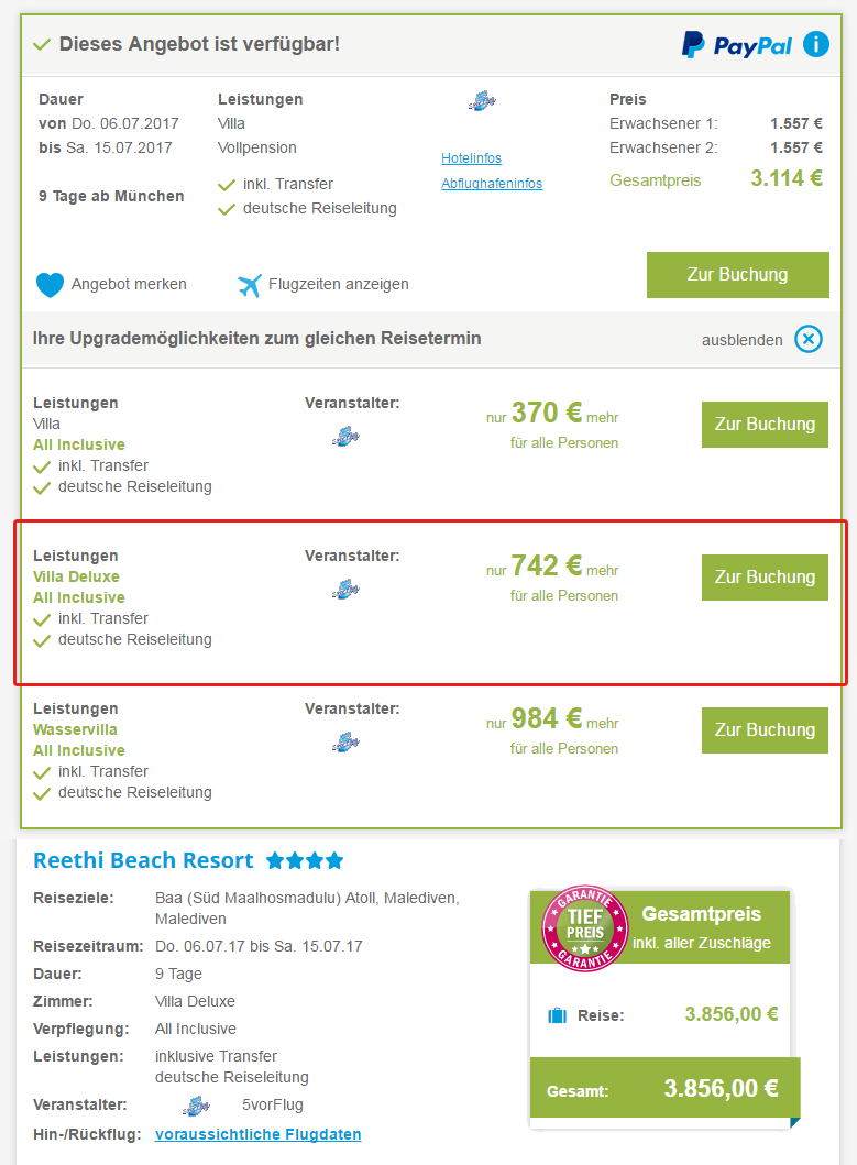 Wichtig: Über unseren Link gelangt ihr zuerst zu einem Angebot „Villa, Vollpension“, ihr könnt euch aber bessere Leistungen anzeigen lassen. Dort findet ihr den rot hervorgehobenen Deal (s. Screenshot) mit Deluxe Villa und All Inclusive für insgesamt 3.856€ für 2 Personen. Das entspricht 1.928€ pro Person.