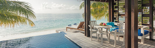 Übernachte direkt am Strand mit dem Blick aufs Meer. Die Beach Villen im maledivischen Stil verkörpern Luxus und Tradition in einem. Genieße die Badewanne und Dusche im Freien und nutze den direkten Zugang zum Strand, um Dich abzukühlen.
