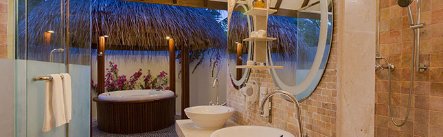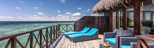 Inmitten der Flora der Malediven sind die Superior Villen mit den weißen Wänden den modernen Möbeln und den Duschen in freiem mit den Mosaikdetails ein echter Hingucker mit absolutem Komfort. Die private Terrasse lädt zum Verweilen und Entspannen ein.