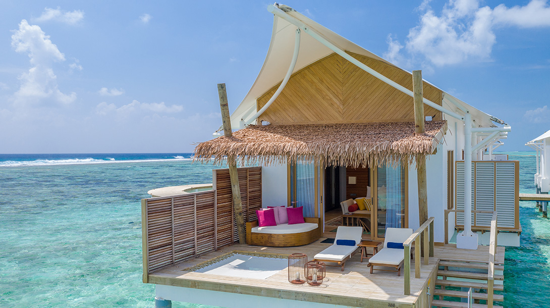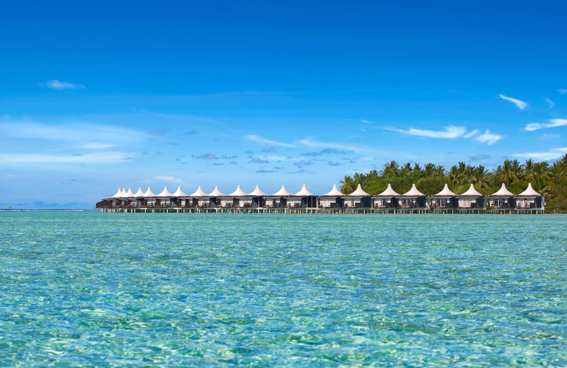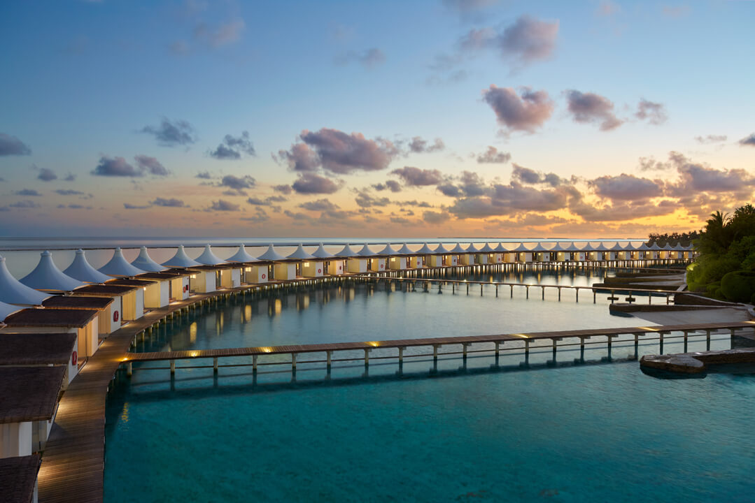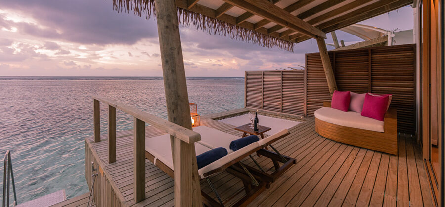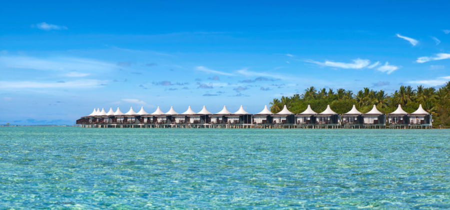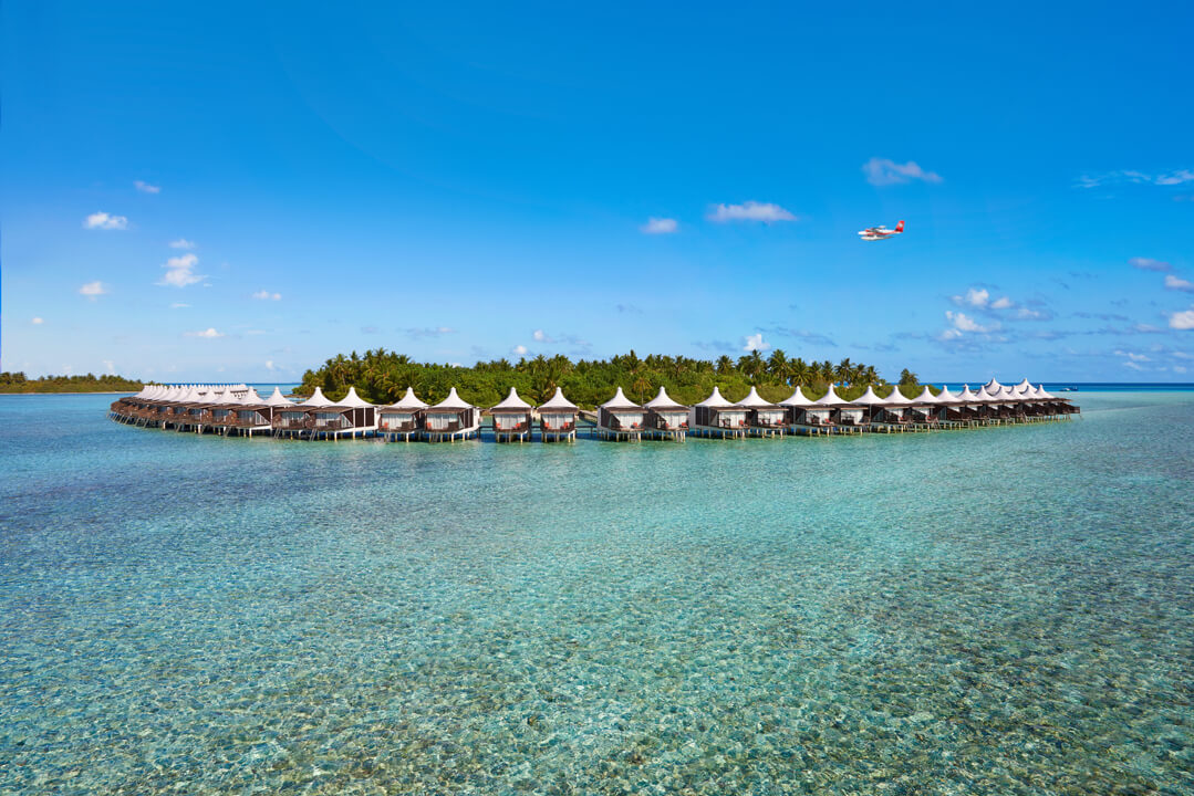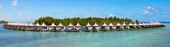 Die Wasserbungalows des Resorts weisen eine noch exklusivere Lage als die Strandbungalows auf und befinden sich, wie ihr Name bereits vorgibt, in halbkreisförmiger Anordnung direkt über dem Ozean. Ähnlich wie die Strandbungalows besitzen die Wasserunterkünfte ein privates Sonnendeck mit Sonnenliegen, auf denen Du Dich wunderbar sonnen und tolle Sonnenuntergänge bestaunen kannst. Doch das Beste kommt noch: Mitten im Zimmer befindet sich ein Glasfußboden, der einen tollen Blick in die Unterwasserwelt der Malediven aus dem privaten Wohnzimmer ermöglicht!