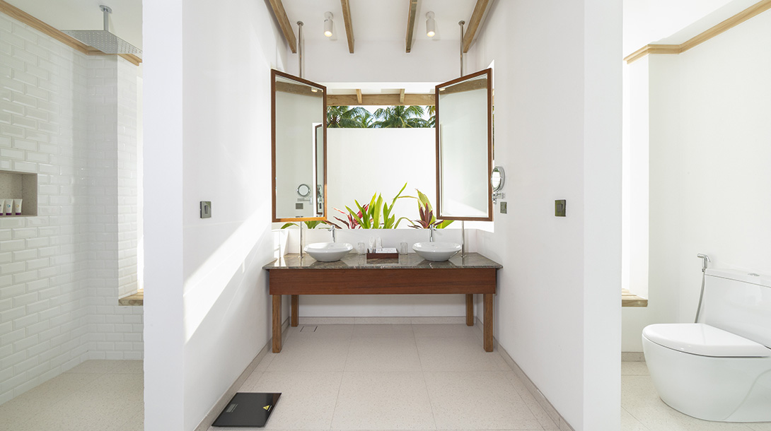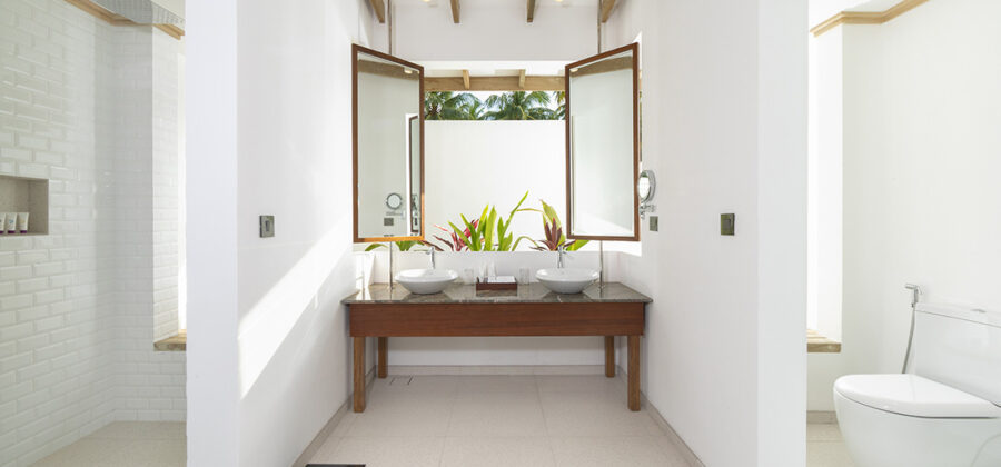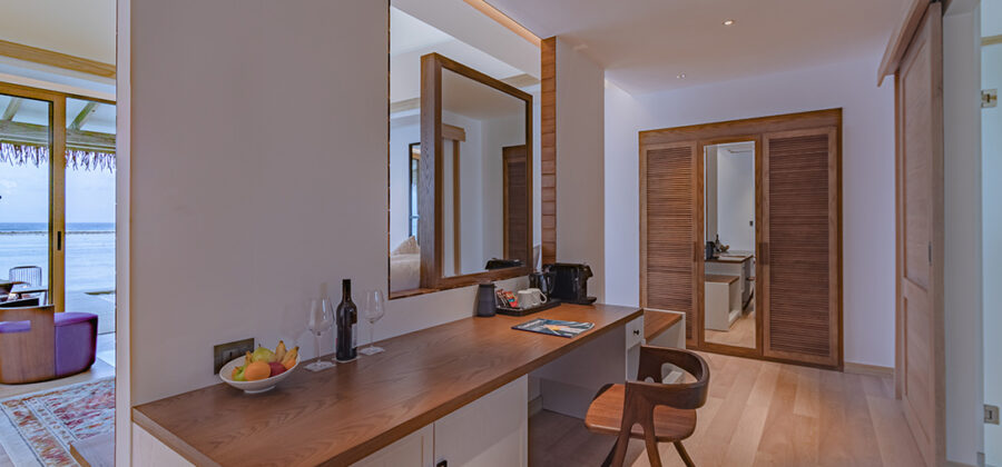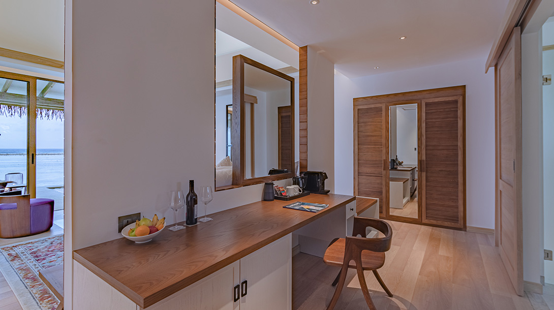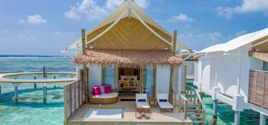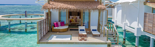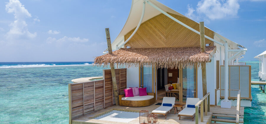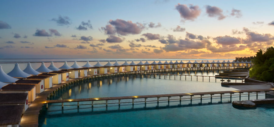 Die Wasserbungalows des Resorts weisen eine noch exklusivere Lage als die Strandbungalows auf und befinden sich, wie ihr Name bereits vorgibt, in halbkreisförmiger Anordnung direkt über dem Ozean. Ähnlich wie die Strandbungalows besitzen die Wasserunterkünfte ein privates Sonnendeck mit Sonnenliegen, auf denen Du Dich wunderbar sonnen und tolle Sonnenuntergänge bestaunen kannst. Doch das Beste kommt noch: Mitten im Zimmer befindet sich ein Glasfußboden, der einen tollen Blick in die Unterwasserwelt der Malediven aus dem privaten Wohnzimmer ermöglicht!
