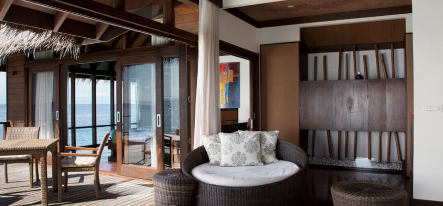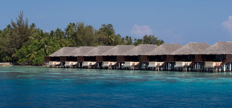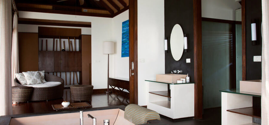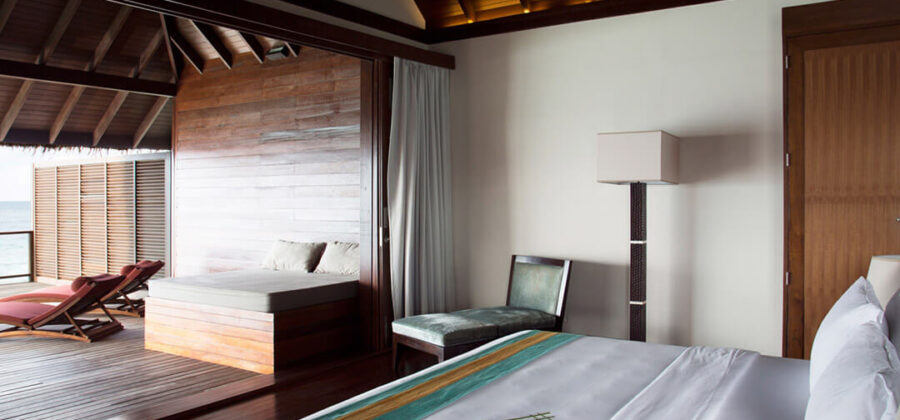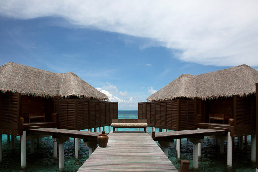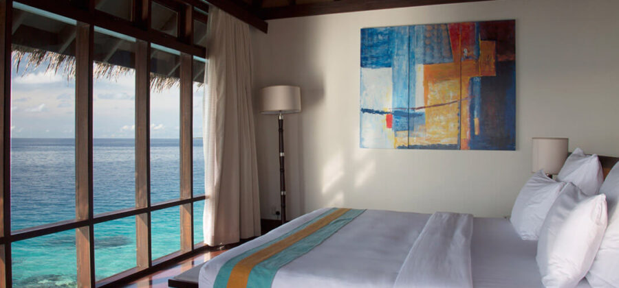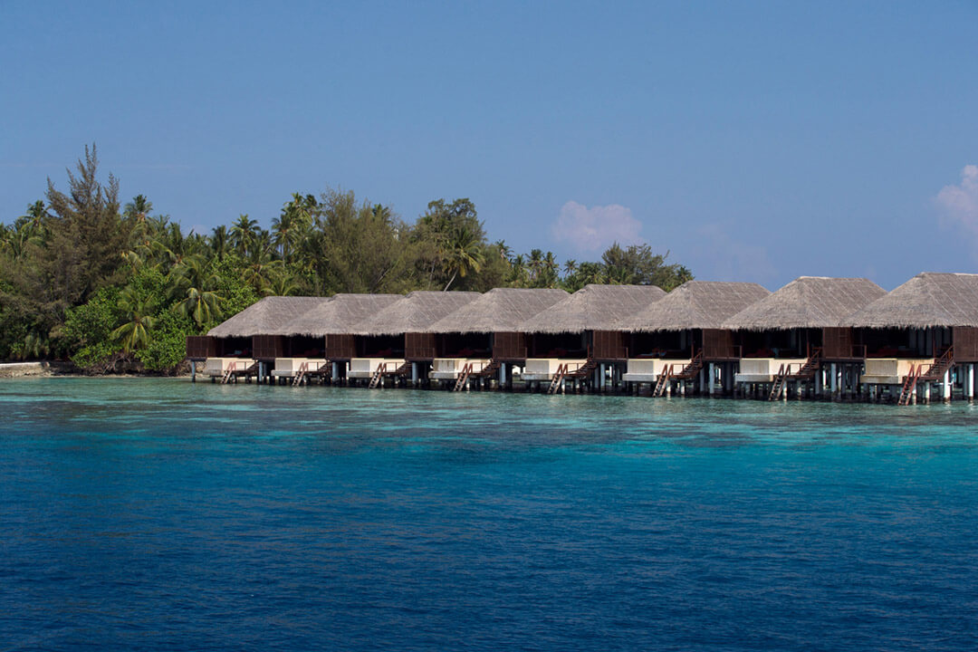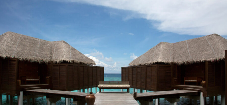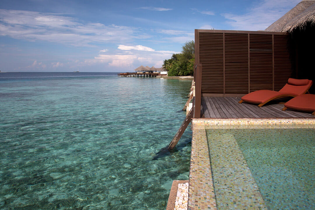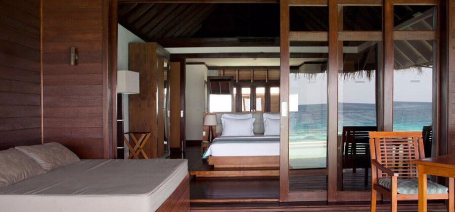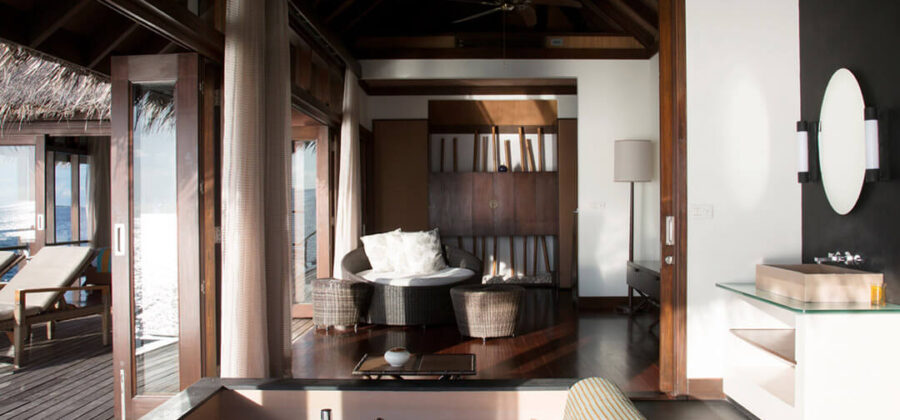 Die 16 Wasservillen mit einer Grundfläche der Zimmer von rund 109 qm etwas kleiner als die Island Villen. Allerdings entsprechen die Wasservillen deutlich eher dem Traum einer Malediven Villa als irgendein anderer Unterkunftstyp auf einer Insel der Malediven. Auf Stelzen in die Lagune gebaut, sind diese Villen nur über einen Holzsteg erreichbar und liegen ansonsten komplett über dem Wasser. In puncto Einrichtung der Zimmer besticht die Wasser Villa mit einem Kingsize-Bett, einem eigenen möblierten Sonnendeck und einem direktem Zugang zur Lagune.
