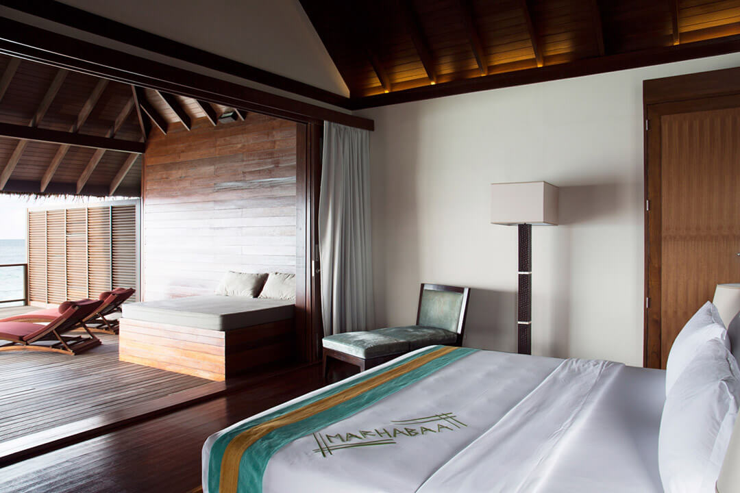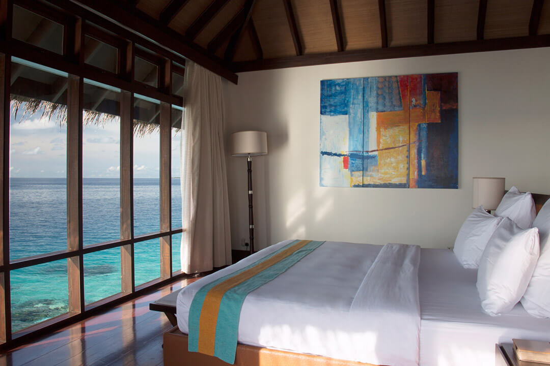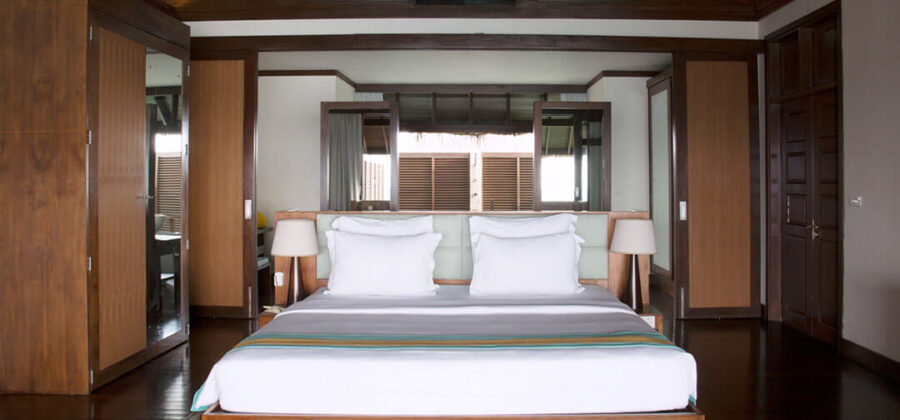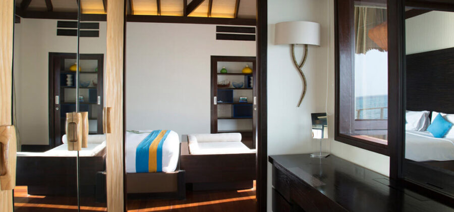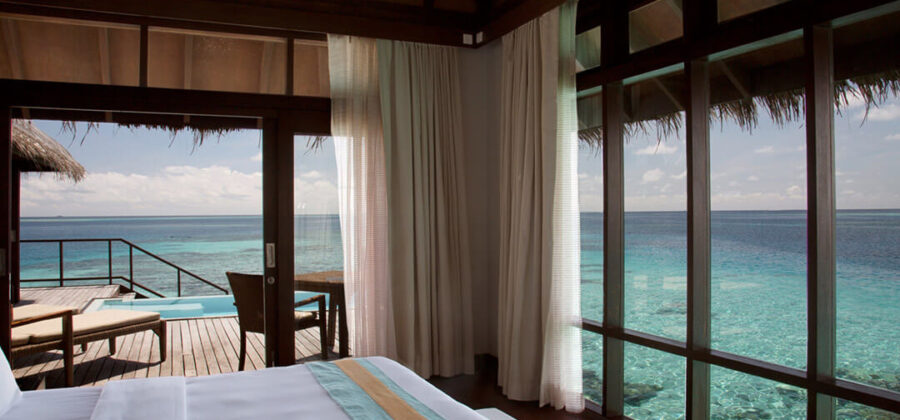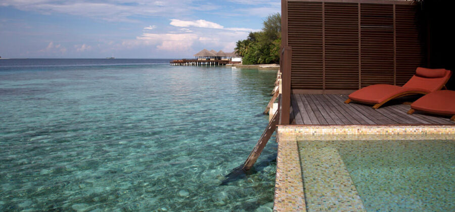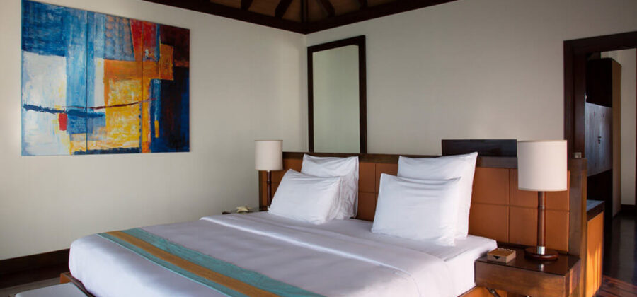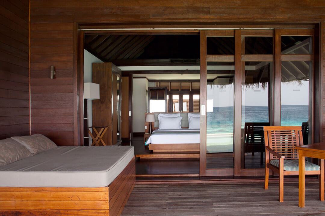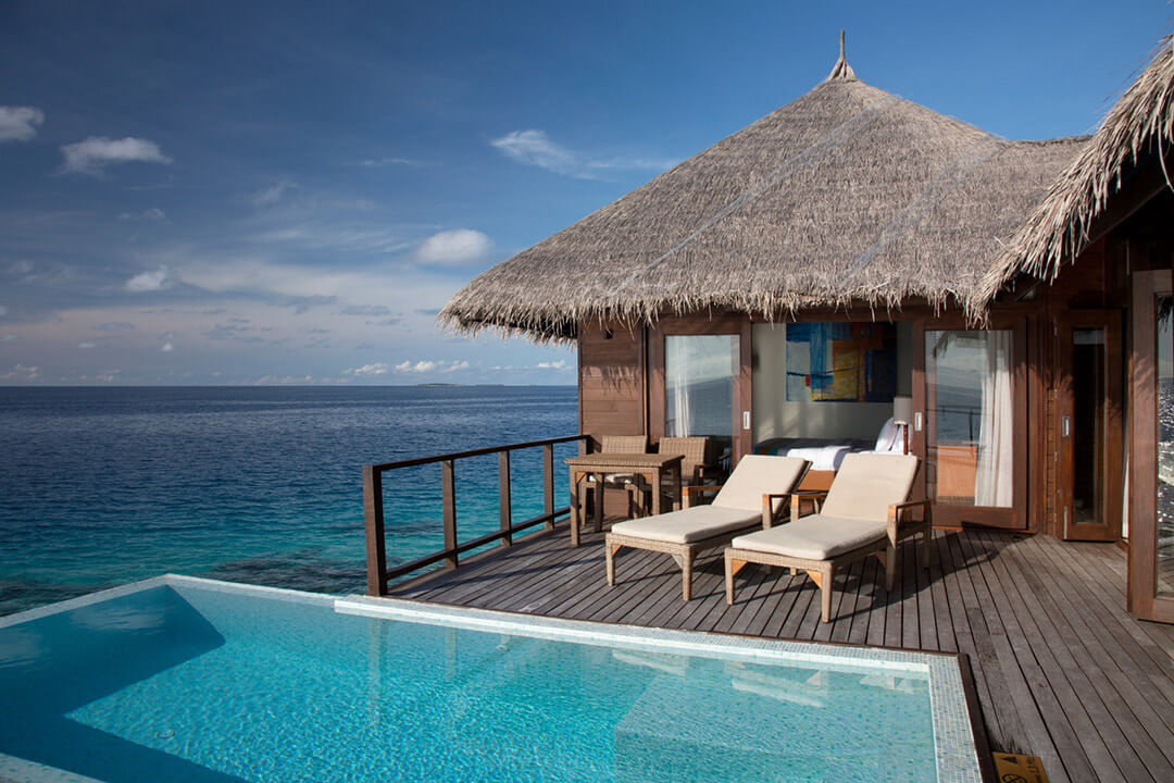 Die 16 Wasservillen mit einer Grundfläche der Zimmer von rund 109 qm etwas kleiner als die Island Villen. Allerdings entsprechen die Wasservillen deutlich eher dem Traum einer Malediven Villa als irgendein anderer Unterkunftstyp auf einer Insel der Malediven. Auf Stelzen in die Lagune gebaut, sind diese Villen nur über einen Holzsteg erreichbar und liegen ansonsten komplett über dem Wasser. In puncto Einrichtung der Zimmer besticht die Wasser Villa mit einem Kingsize-Bett, einem eigenen möblierten Sonnendeck und einem direktem Zugang zur Lagune.