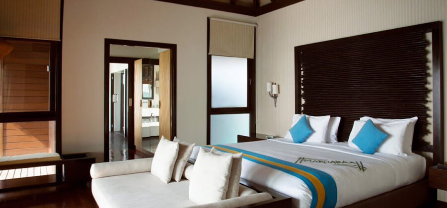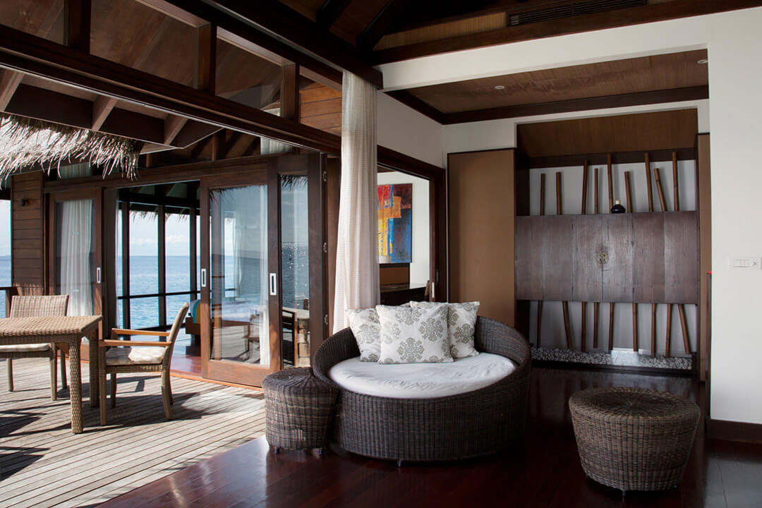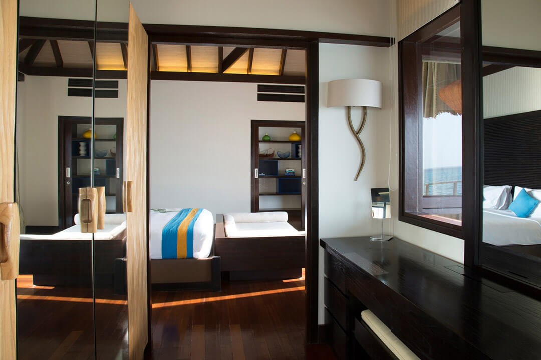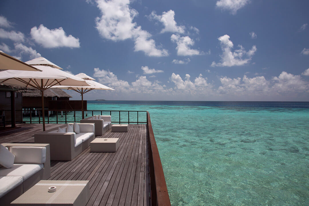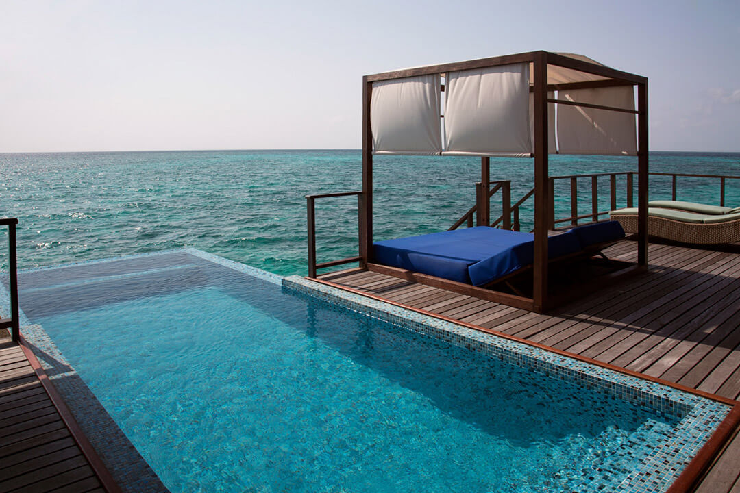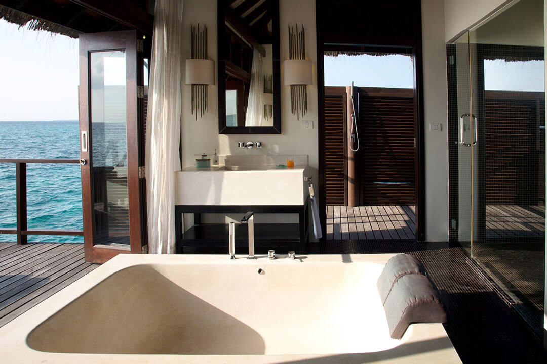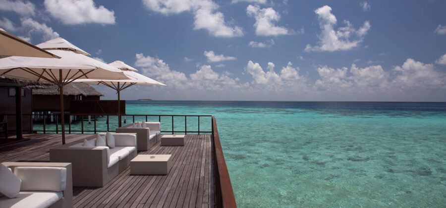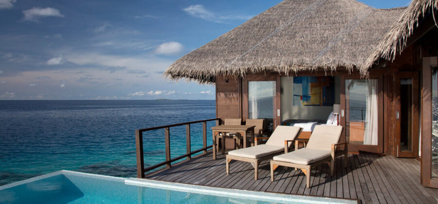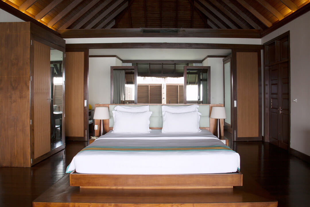 Die 16 Wasservillen mit einer Grundfläche der Zimmer von rund 109 qm etwas kleiner als die Island Villen. Allerdings entsprechen die Wasservillen deutlich eher dem Traum einer Malediven Villa als irgendein anderer Unterkunftstyp auf einer Insel der Malediven. Auf Stelzen in die Lagune gebaut, sind diese Villen nur über einen Holzsteg erreichbar und liegen ansonsten komplett über dem Wasser. In puncto Einrichtung der Zimmer besticht die Wasser Villa mit einem Kingsize-Bett, einem eigenen möblierten Sonnendeck und einem direktem Zugang zur Lagune.