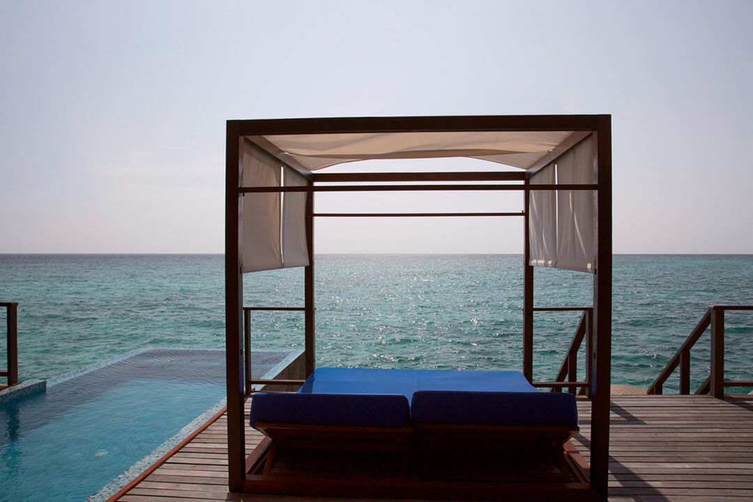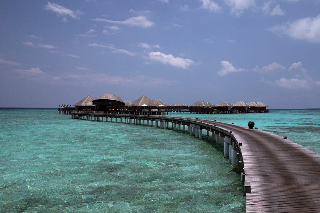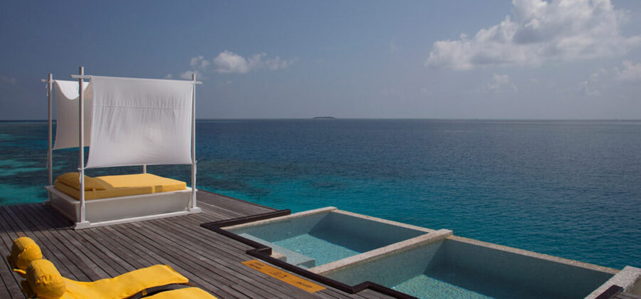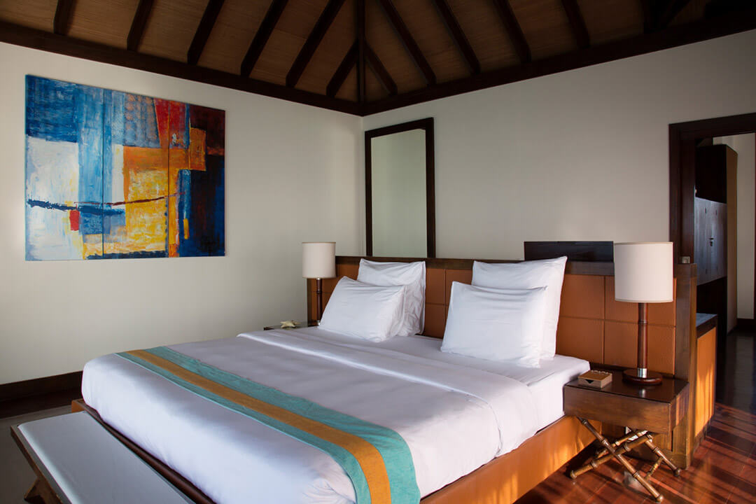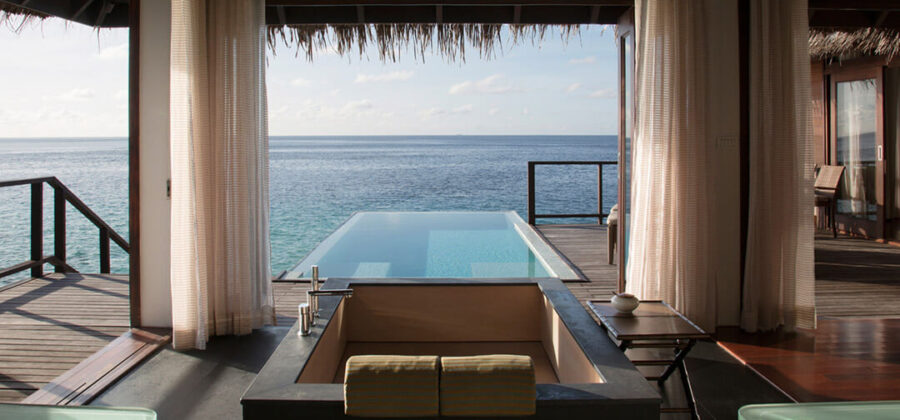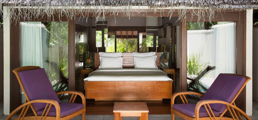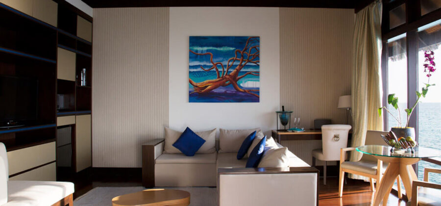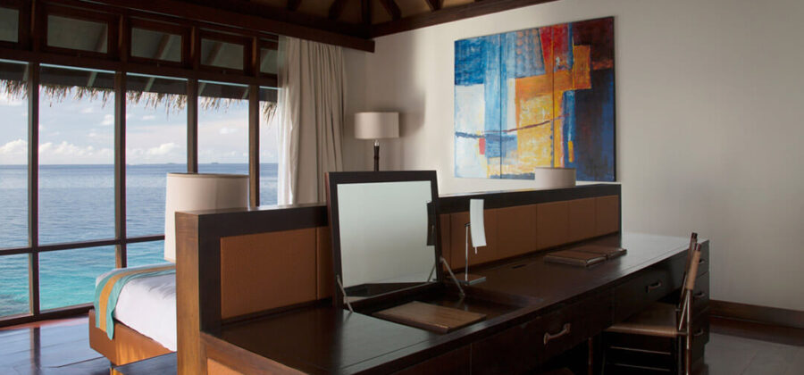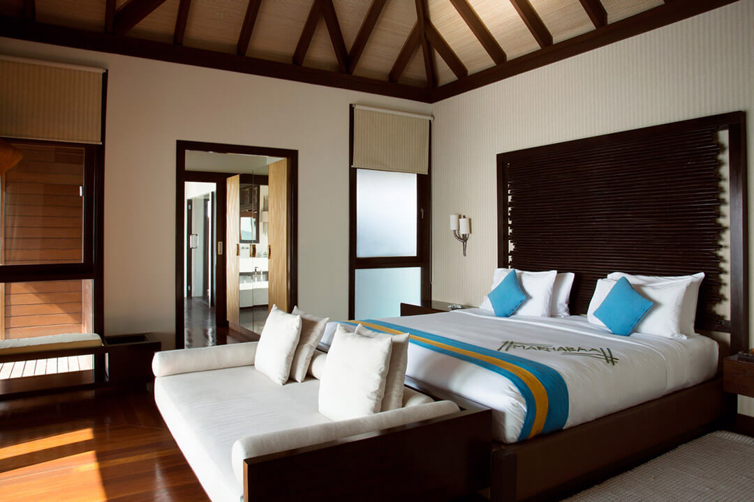 Die 16 Wasservillen mit einer Grundfläche der Zimmer von rund 109 qm etwas kleiner als die Island Villen. Allerdings entsprechen die Wasservillen deutlich eher dem Traum einer Malediven Villa als irgendein anderer Unterkunftstyp auf einer Insel der Malediven. Auf Stelzen in die Lagune gebaut, sind diese Villen nur über einen Holzsteg erreichbar und liegen ansonsten komplett über dem Wasser. In puncto Einrichtung der Zimmer besticht die Wasser Villa mit einem Kingsize-Bett, einem eigenen möblierten Sonnendeck und einem direktem Zugang zur Lagune.