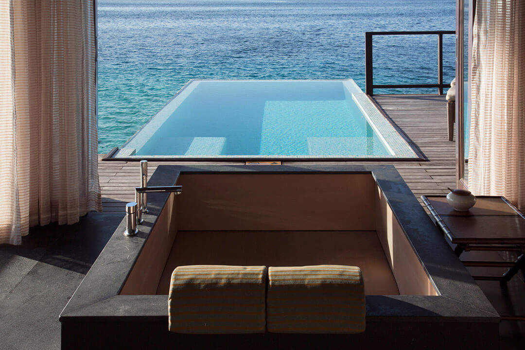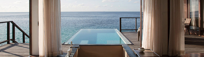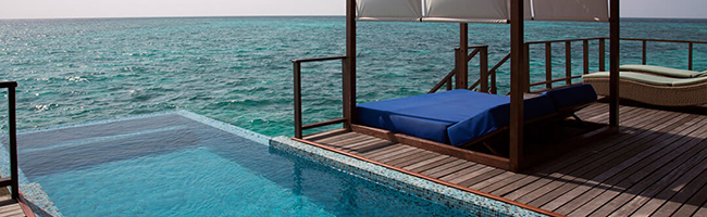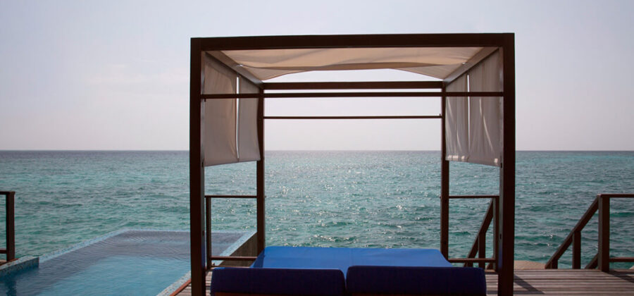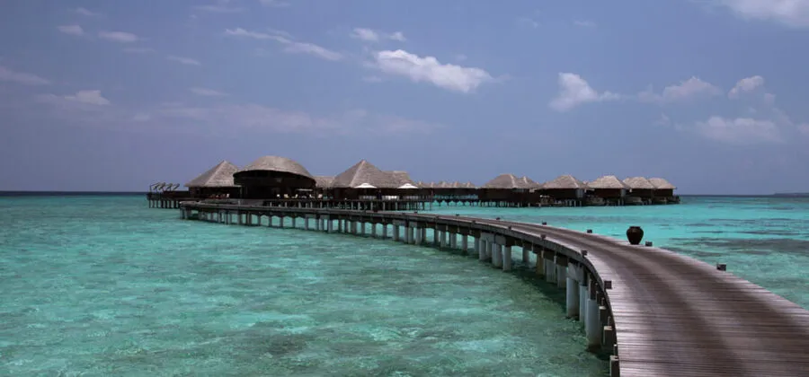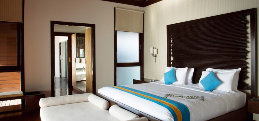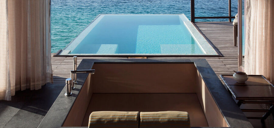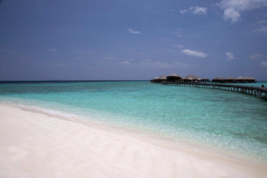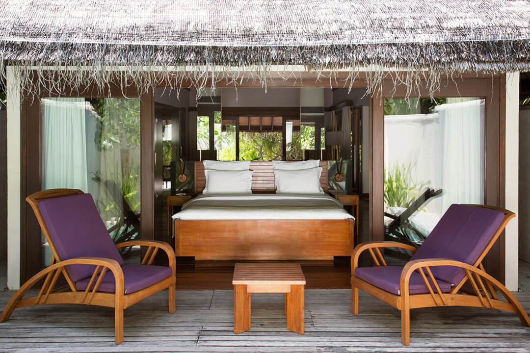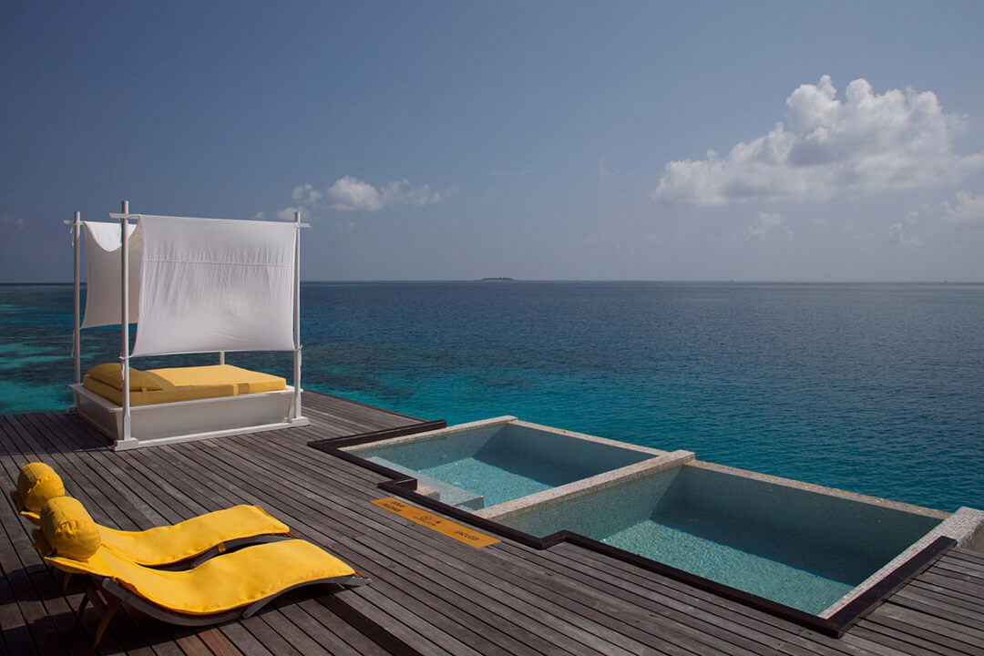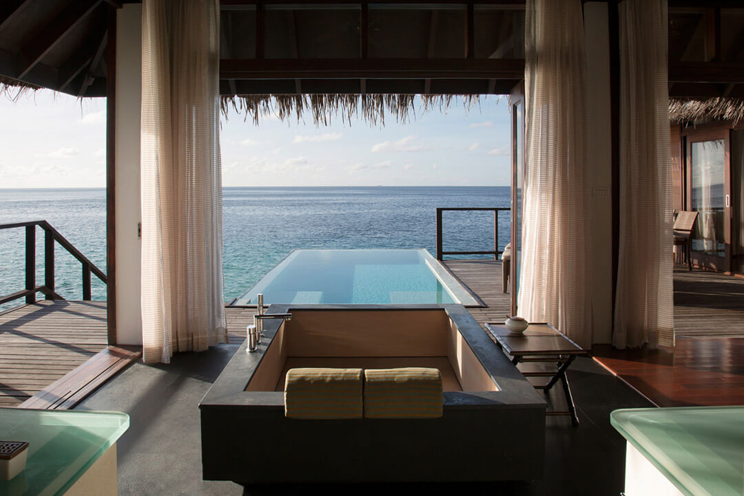 Die 16 Wasservillen mit einer Grundfläche der Zimmer von rund 109 qm etwas kleiner als die Island Villen. Allerdings entsprechen die Wasservillen deutlich eher dem Traum einer Malediven Villa als irgendein anderer Unterkunftstyp auf einer Insel der Malediven. Auf Stelzen in die Lagune gebaut, sind diese Villen nur über einen Holzsteg erreichbar und liegen ansonsten komplett über dem Wasser. In puncto Einrichtung der Zimmer besticht die Wasser Villa mit einem Kingsize-Bett, einem eigenen möblierten Sonnendeck und einem direktem Zugang zur Lagune.