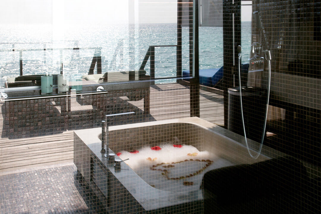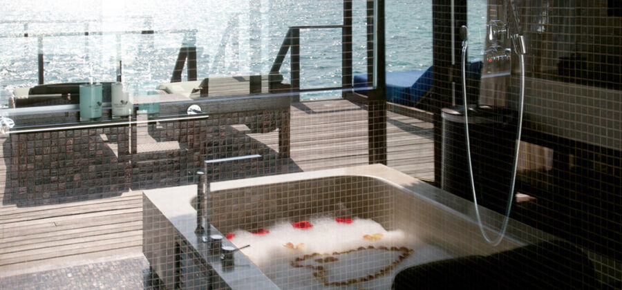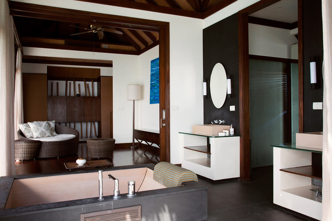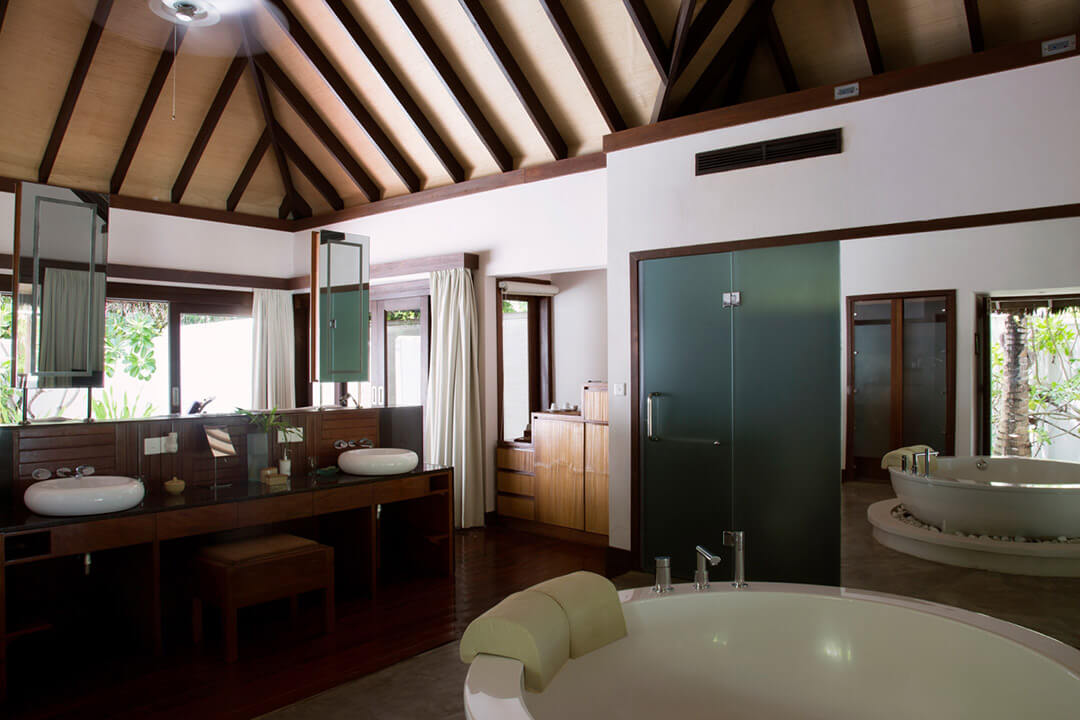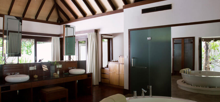 Auch die Escape Water Villa ist 16 Mal im Coco Bodu Hithi anzutreffen. Mit einer Grundfläche von gut 144 qm entpuppt sich die Excape Water Villa als etwas größer als die normale Water Villa. Ansonsten entspricht die Ausstattung aber nahezu komplett der einer Wasservilla. Allerdings -und das ist die Besonderheit – verfügt die Escape Water Villa über eine separate Außendusche, in welcher Du das sanfte Meeresrauschen hören kannst, während du dich säuberst. Außerdem gibt es separate Wohn- und Schlafzimmer.