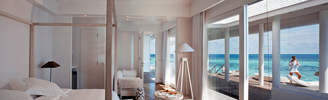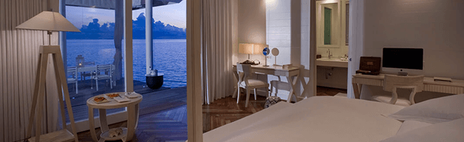 Als besonders elegant entpuppt sich die Wasser Villa mit zwei Schlafzimmern. 2 Villen dieser Art hat das Diamonds Athuruga anzubieten. Jeweils am Ende des Piers untergebracht, verfügen diese Villen nicht nur über 2 Schlafzimmer, sondern auch über eine große, gemeinsame Terrasse, die einen Jacuzzi beherbergt. Natürlich ist auch hier die Einrichtung erwähnenswert: Hochwertiges Rattan Mobiliar und moderne, italienische Designerlampen innerhalb der Zimmer verleihen der Wasser Villa mit zwei Schlafzimmern einen exquisiten Charme. Ansonsten ist die Einrichtung mit der einer normalen Wasser Villa absolut identisch. Der auffälligste Unterschied liegt tatsächlich in der Anzahl der Zimmer.