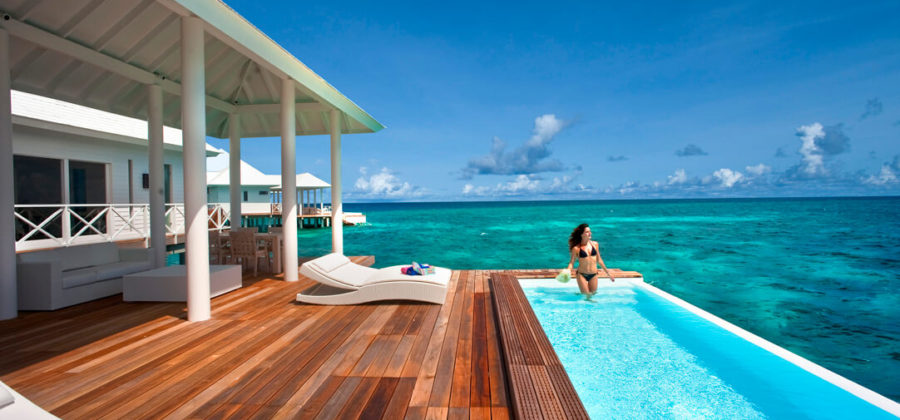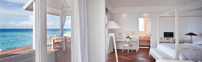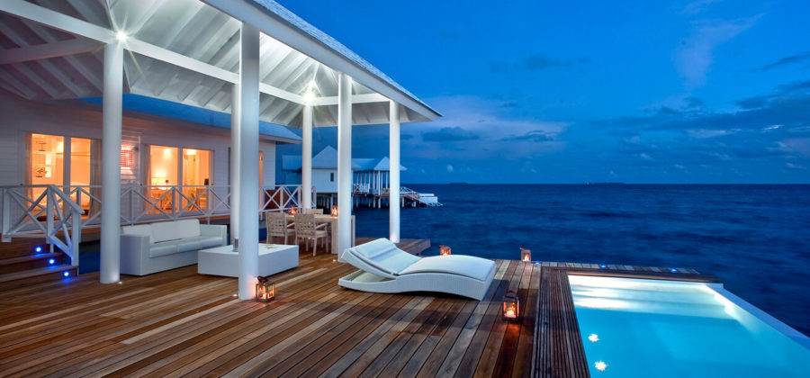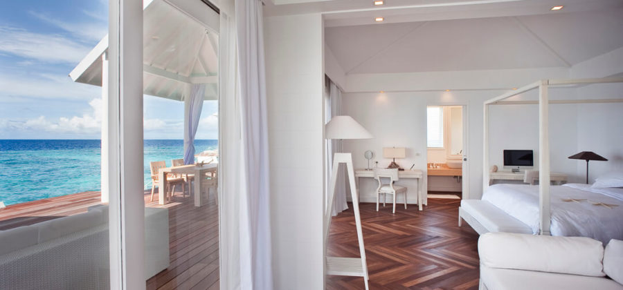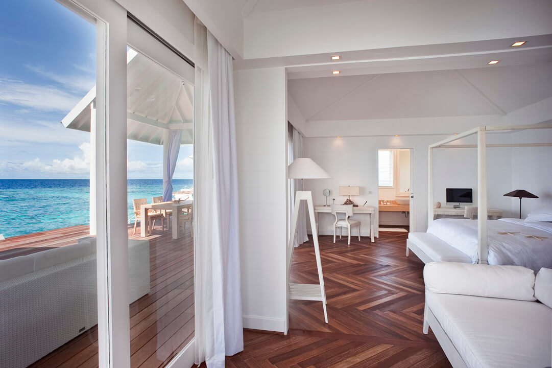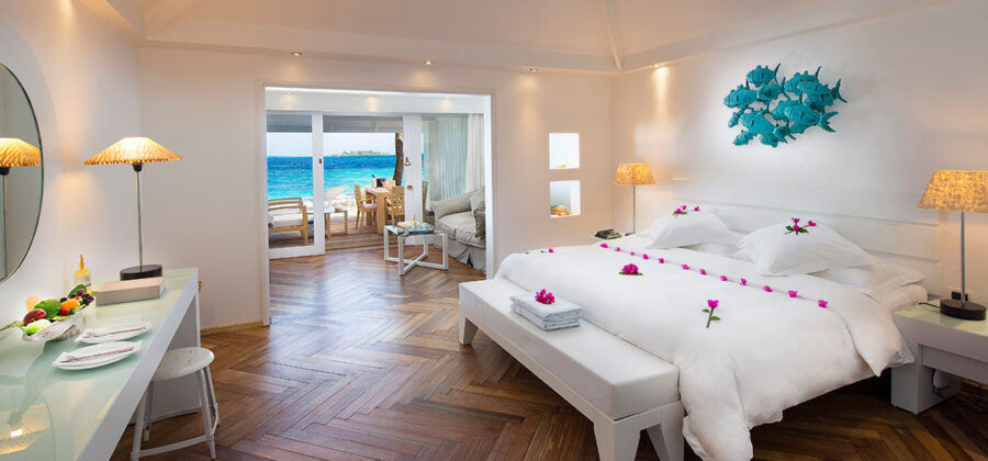 Die Wasservillen mit zwei Schlafzimmern werden im Thudufushi 2 Mal angeboten und bilden die höchste Luxusklasse der Unterkünfte im Thudufushi. Diese Wasservillen mit zwei separaten Schlafzimmern befinden sich am Ende des Piers in exponierter Lage und verfügen über eine Privatterrasse. Auf der Terrasse erwartet Dich zwar kein Jacuzzi, dafür aber ein richtiger Swimmingpool – natürlich mit bestem Blick aufs Meer und einem eigenen Zugang in die Fluten des Indischen Ozeans. Ansonsten ist die Einrichtung identisch mit der der Jacuzzi Wasser Villen.