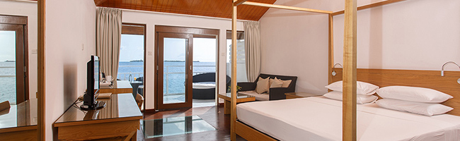 Die Embudu Village Wasserbungalows sind ähnlich eingerichtet wie die Embudu Village Superior Zimmer. Nur mit dem Unterschied, dass sie deutlich luxuriöser und komfortabler bzw. hochwertiger in der Auswahl der Möbelstücke sind. Zusätzlich verfügen die Embudu Village Wasserbungalows über eine Sitzecke im Innenraum, eine Kaffeemaschine, Kabel-TV, eine Hydromassage Badewanne, eine große, möblierte Veranda mit einem wunderbaren Blick über die Lagune und über Sichtfenster im Boden, die es Dir ermöglichen, das Treiben der Tiere unter Deinem Wasser Bungalow zu verfolgen.
