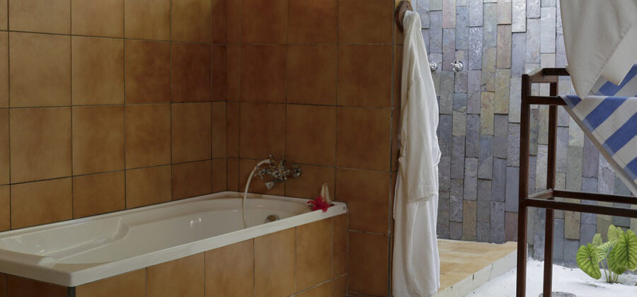 - Halboffenes Badezimmer mit zusätzlicher Badewanne