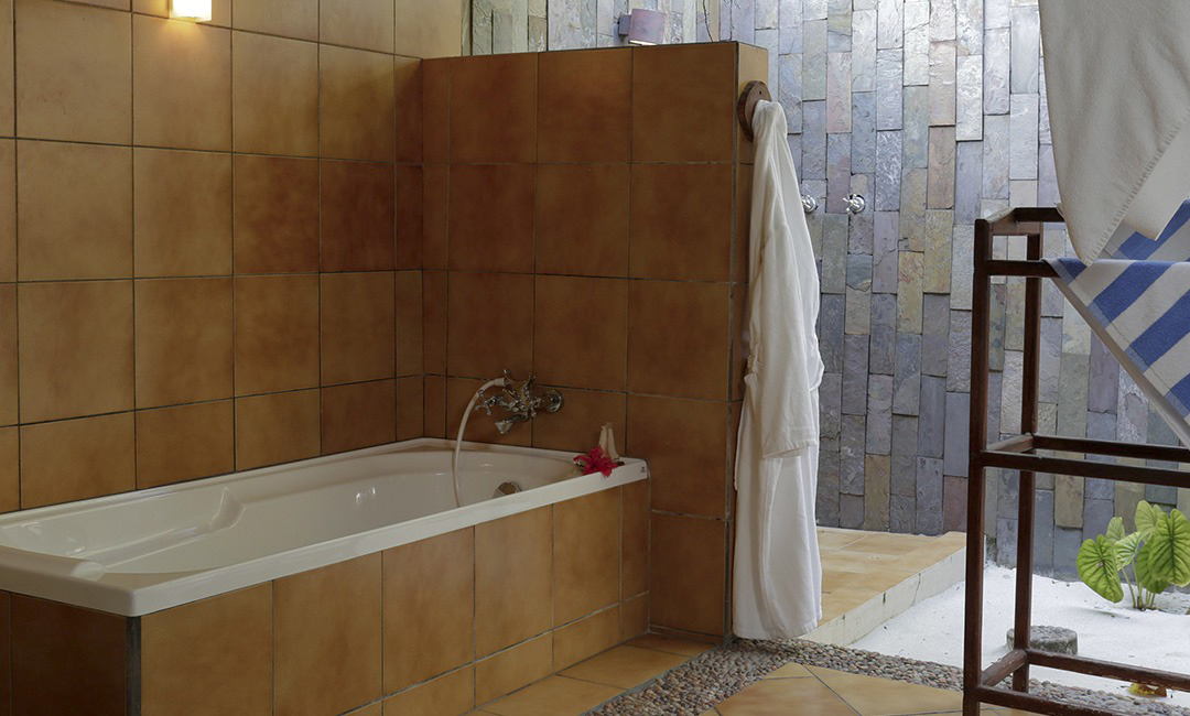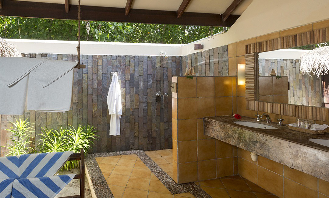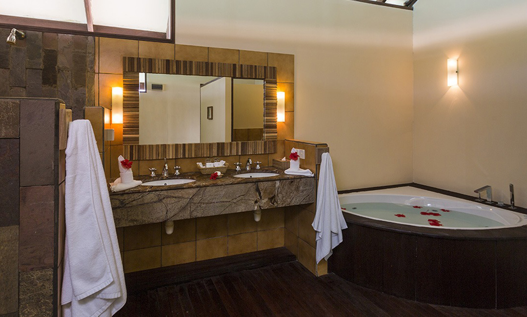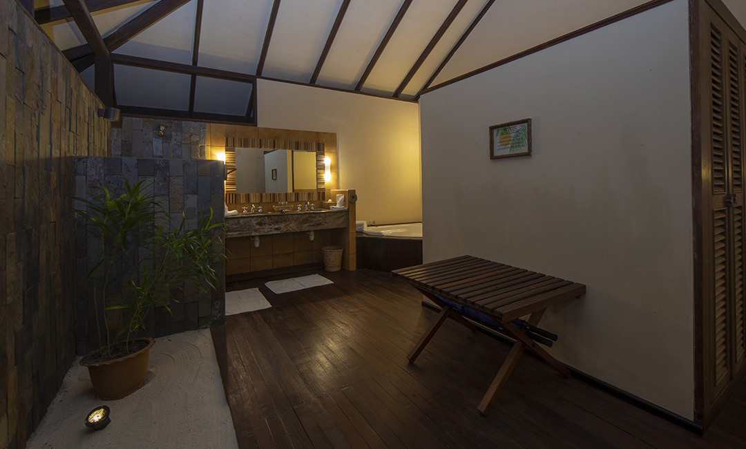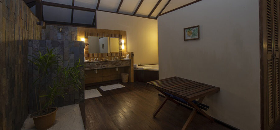Die Deluxe Villa im Filitheyo Island Resort Malediven ist ebenso eingerichtet wie die Superior Villa nur mit einigen zusätzlichen Extras. Erst einmal ist die Deluxe Villa mit einer Grundfläche von 67 qm ein wenig größer als die Superior Villa. Im Gegensatz zur Superior Villa sind die Deluxe Villen nicht in Reihenbungalows untergebracht, sondern stehen allein und bieten dadurch das gewisse Extra an Privatsphäre. Darüber hinaus verfügen die Deluxe Villen im Filitheyo Island Resort Malediven über ein halboffenes Badezimmer mit einer zusätzlichen Badewanne.