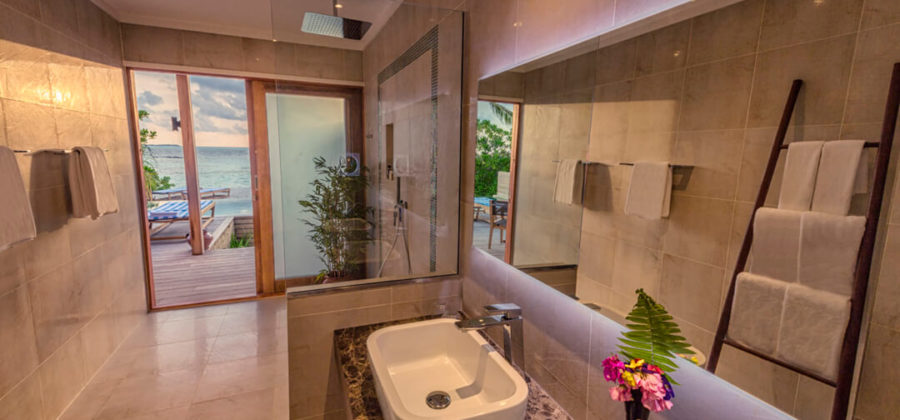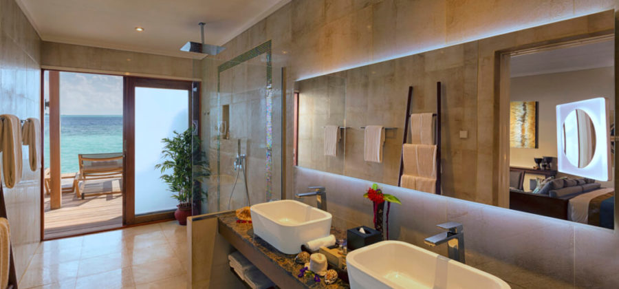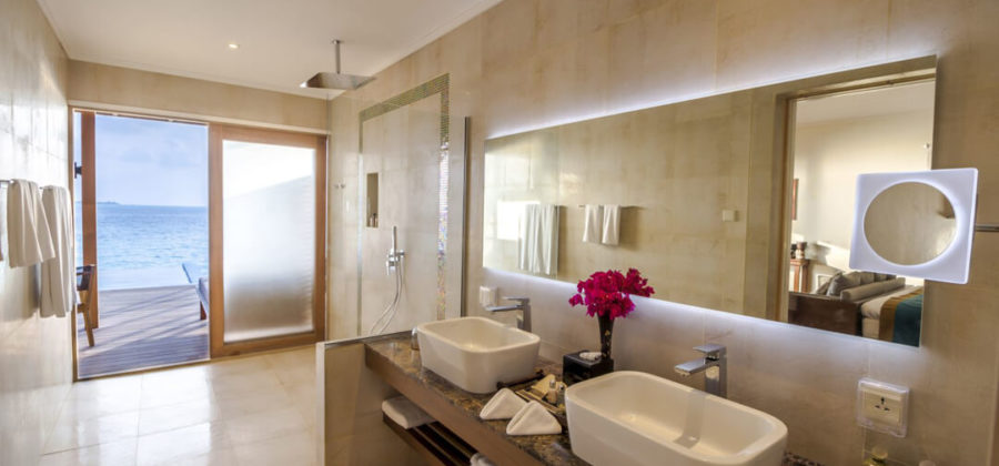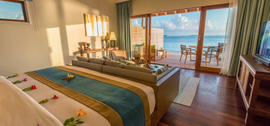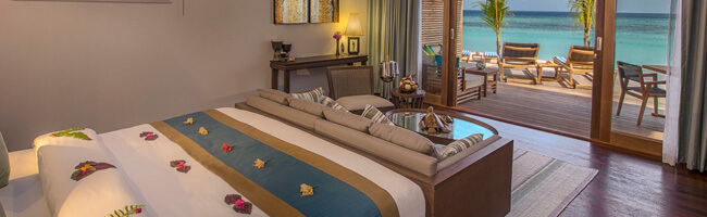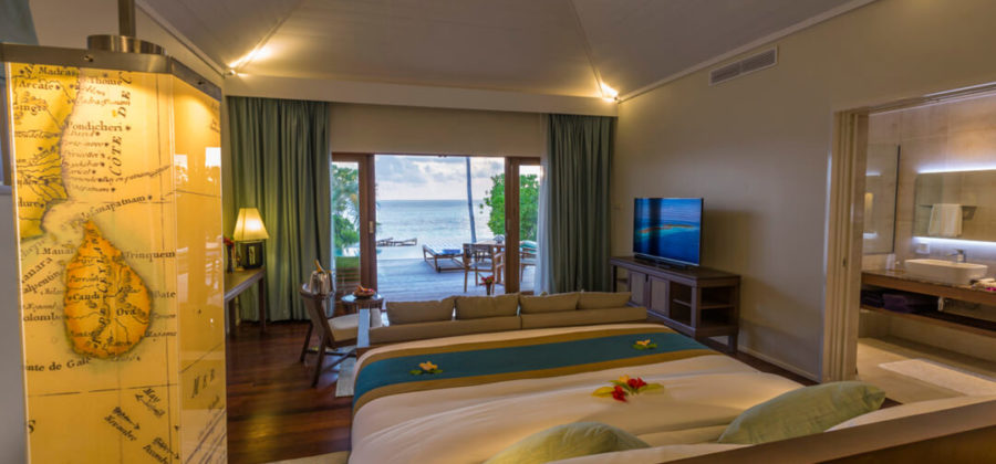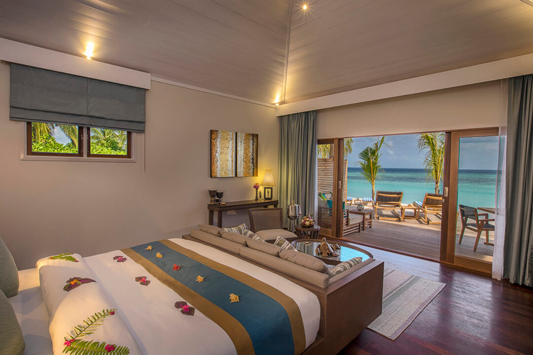 Anders als die Beach Villen befinden sich die Ocean Villen allesamt über dem glasklaren Wasser des Indischen Ozeans. Die Ocean Villa verfügt zwar über dieselbe Grundfläche sowie ein ähnliches Mobiliar und Design wie die Beach Villa, dennoch versprüht sie dank ihrer Lage über dem Wasser einen etwas stärkeren Hauch von Exklusivität und Luxus. Zudem besitzt sie eine Treppe, mithilfe derer Du Dich direkt von Deiner Terrasse in die warmen Fluten des türkisblauen Meeres begeben kannst.