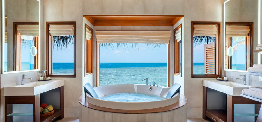 Übernachte in Mitten des Ozeans und erwache mit den ersten Sonnenstrahlen des Tages. Gucke vom Bett aus direkt aufs Meer und genieße das Rauschen des Meeres. Der Ocean Bungalow with Pool bietet unzählige Möglichkeiten Entspannung zu finden. Nutze den direkten Zugang zum Ozean oder schwimme im Infinity Pool auf der großzügig angelegten Terrasse. Im Inneren kannst Du durch ein Glasfenster im Boden die farbenfrohe Unterwasserwelt beobachten oder den Ausblick von der Jet-Badewanne aus genießen.