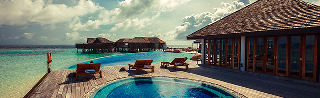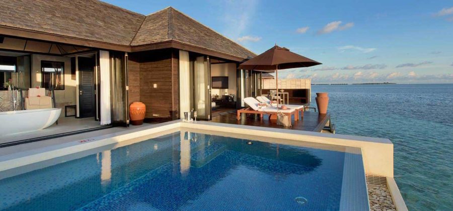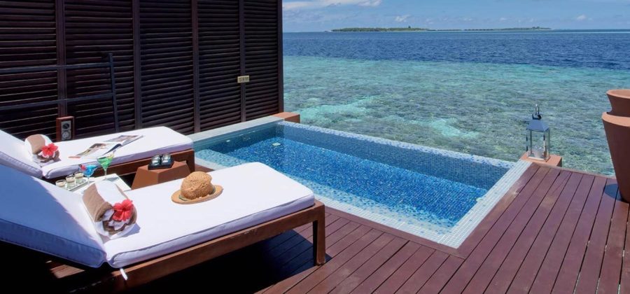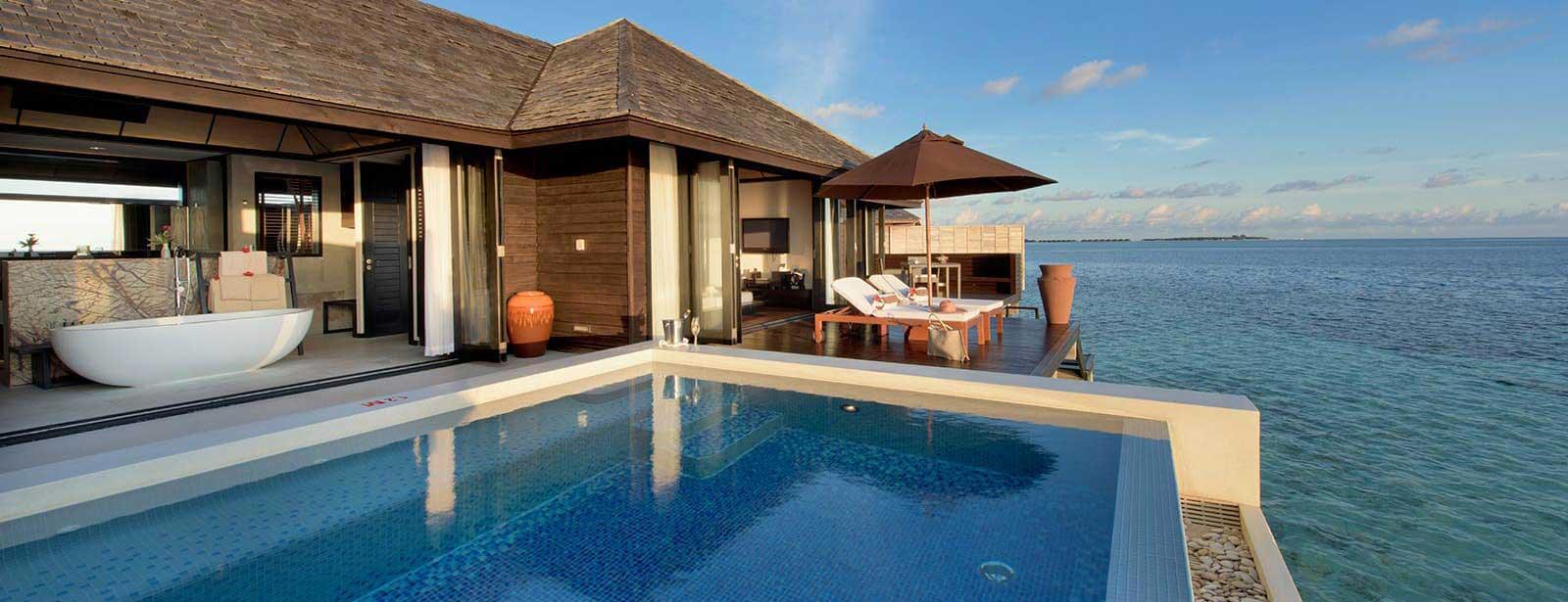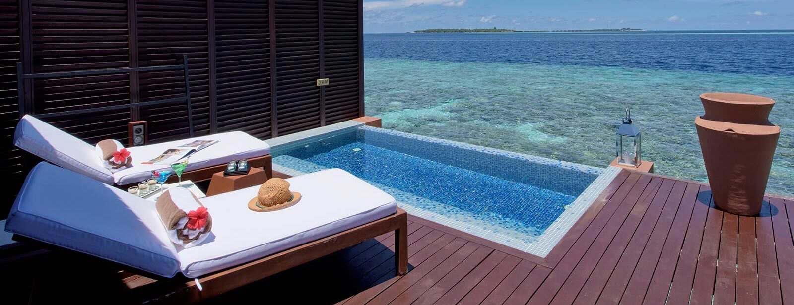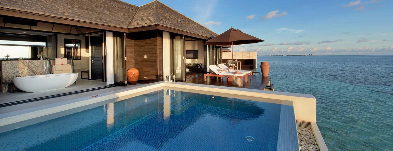 Die Sunset Water Villa im Malediven Lily Beach bietet mit 182 qm noch mehr Platz als die Deluxe Water Villa. Wie der Name schon sagt, liegen diese Unterkünfte zur Sonnenuntergangsseite und bieten damit Abend für Abend einen atemberaubenden Anblick. So kannst du in dieser Unterkunft in einem traumhaften Pool liegen und dabei den wunderschönen Sonnenuntergang genießen. Die Ausstattung der Sunset Water Villa ist übrigens dieselbe wie in der Deluxe Water Villa. Der einzige Unterschied: Die Sunset Water Villen sind größer und verfügen über einen zusätzlichen Butler-Service.
