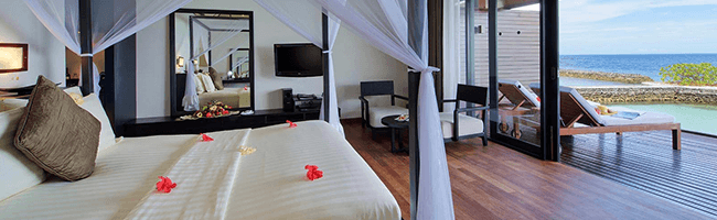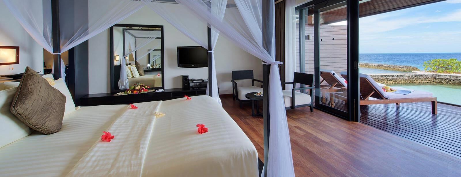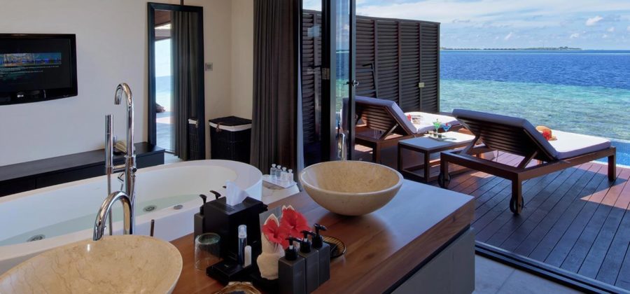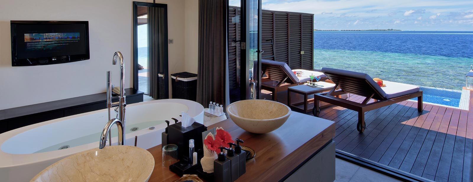 Die Lily Beach Resort & Spa Deluxe Water Villen bringen mit 126 qm Wohnraum sehr viel Platz mit. Ihre Einrichtung ist genauso gestaltet wie die der modernen und stilsicheren Lagoon Villen. Die Lily Beach Resort & Spa Deluxe Water Villa verfügt jedoch zusätzlich über eine freistehende Badewanne mit Jacuzzi sowie einen kleinen Pool auf dem Sonnendeck. Die Deluxe Water Villa bietet somit die perfekten Voraussetzungen für einen traumhaften Malediven Urlaub. Außerdem erhalten Gäste hier bei der Ankunft als Willkommensgeschenk eine Flasche Sekt.