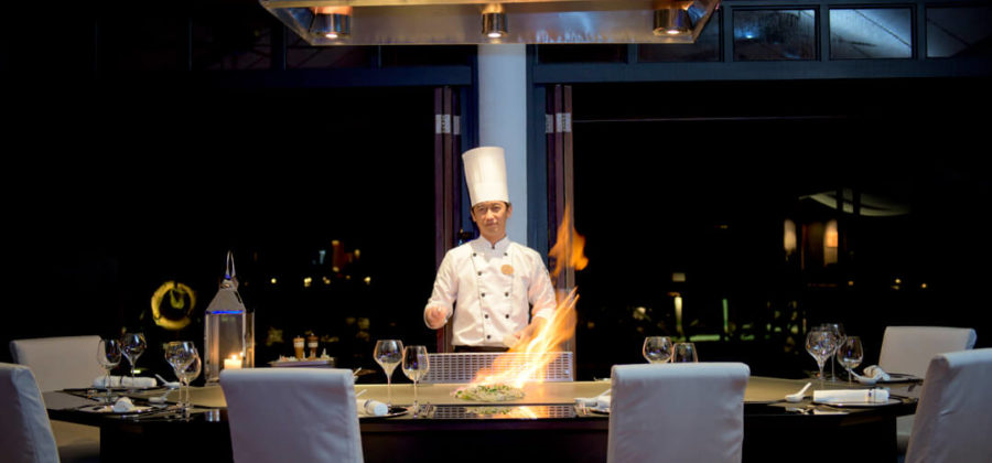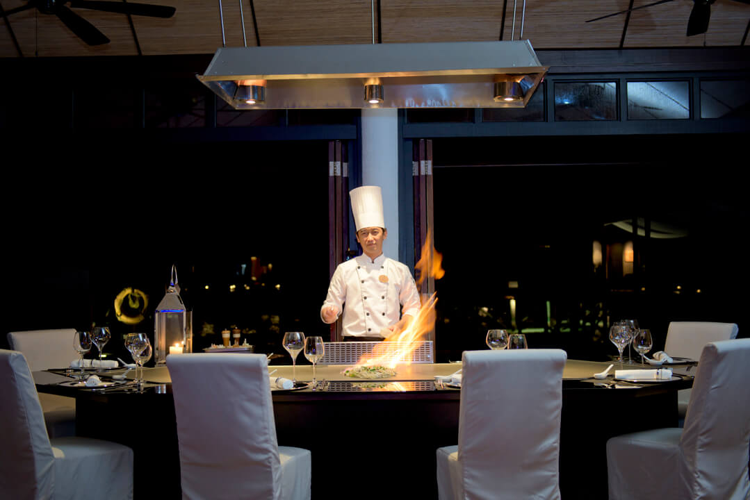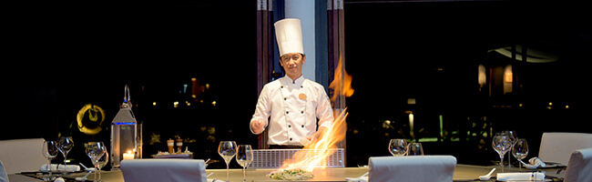 Der Teppanyaki-Grill bietet Dir zweierlei: Zum einen findest Du hier kulinarische Hochgenüsse der ganz besonderen Art und zum anderen kannst Du den Köchen des Hauses bei der Zubereitung direkt auf die Finger schauen- Showcooking vom Allerfeinsten, natürlich auch mit akrobatischen Einlagen.