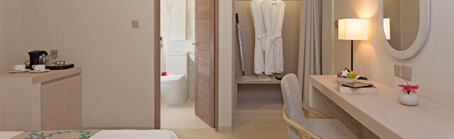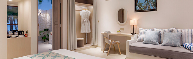 Der Superior Room ist ähnlich eingerichtet und ausgestattet wie der Classic Room, allerdings ist diese Art von Zimmer zur Meerseite ausgerichtet und ermöglicht dadurch einen schönen Blick auf den palmenumsäumten Strand sowie den türkisblauen Ozean.