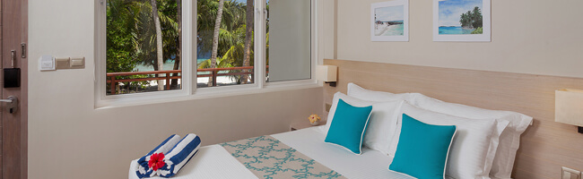 Der Deluxe Room weist eine Größe von 27 qm auf und stellt somit mehr Platz als die vorausgegangenen Unterkünfte zur Verfügung. Dank des zusätzlichen Schlafsofas können auch in dieser Unterkunft des Malahini Kuda Bandos bereits 3 Gäste einen Schlafplatz finden. Ähnlich wie der Superior Room ist auch der Deluxe Room zur Meerseite ausgerichtet und ermöglicht somit einen tollen Blick auf das Meer.