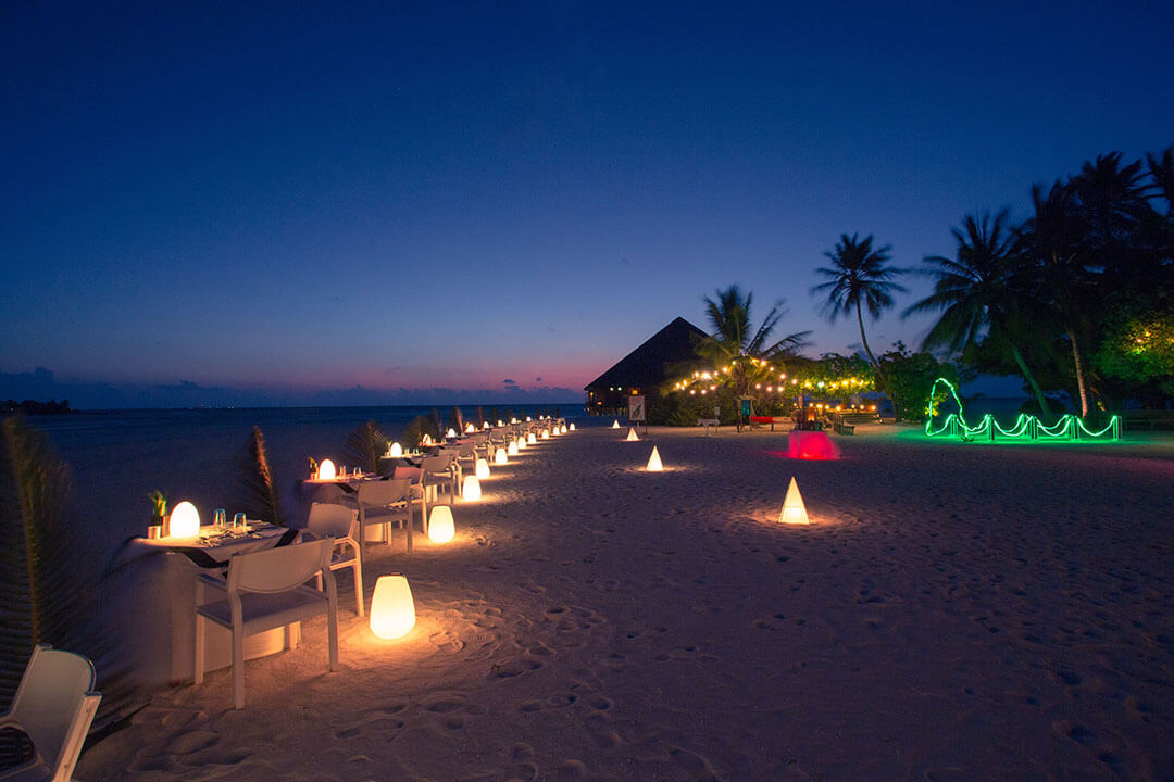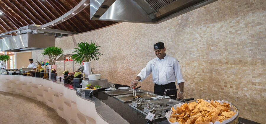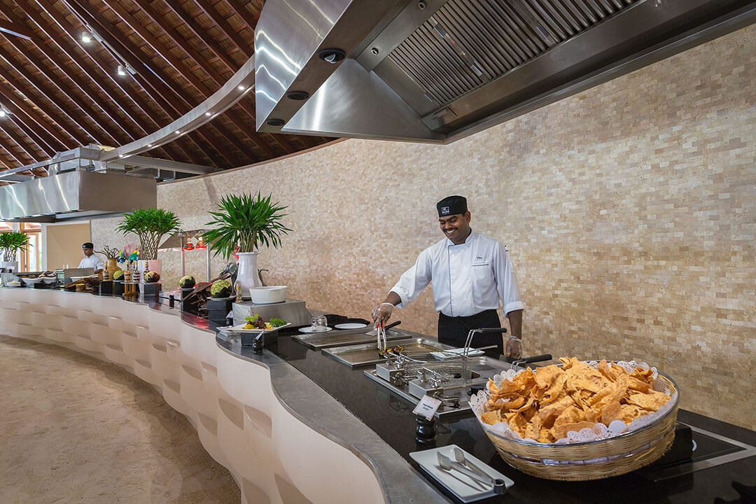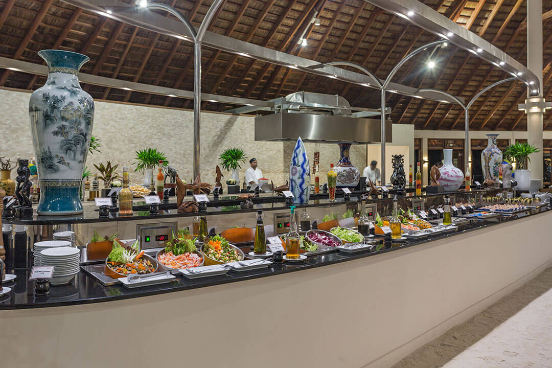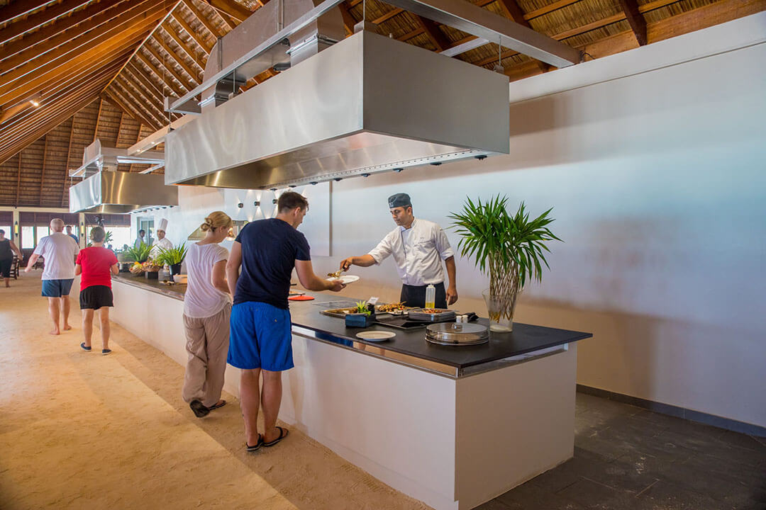 Das Maalan Restaurant wird von den Gästen genutzt, die in den Beach Villen, den Jacuzzi Beach Villen, den Wasser Villen und den Jacuzzi Wasservillen untergebracht sind. Das Restaurant ist am nördlichen Ende der Insel zu finden und bietet drei separate Speisebereiche an, die ebenfalls im Open Air Stil errichtet sind. In diesem Restaurant sind nur Erwachsene zugelassen. Gäste mit Kindern speisen im Farivalhu Restaurant. Des Weiteren finden regelmäßig Themenabende statt. Am Büffet findest Du auch einen Bereich, in dem das Essen live zubereitet wird.