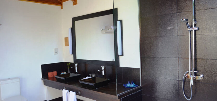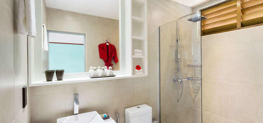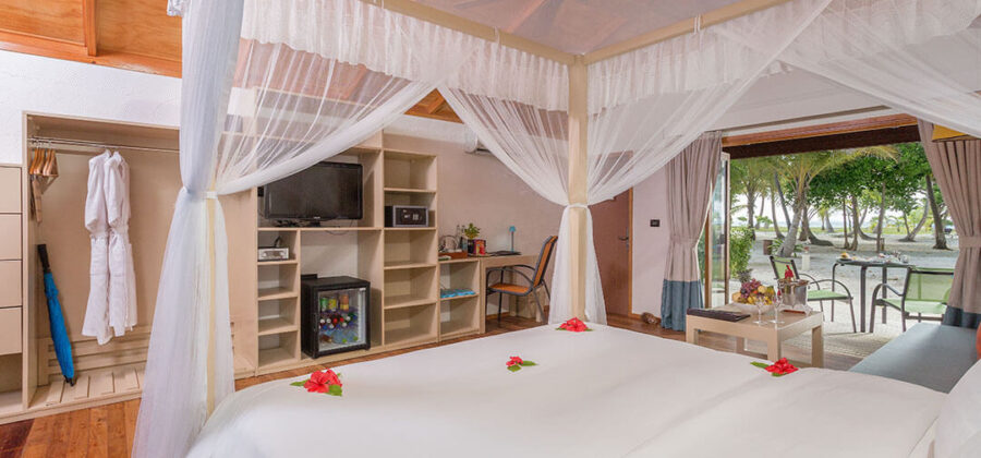 In der nächsten Kategorie kommt dann bereits die Meeru Island Resort Beach Villa. Wie der Name schon sagt, liegt die Meeru Island Resort Beach Villa am Strand oder zumindest in unmittelbarer Strandnähe. Ihre Einrichtung unterscheidet sich nicht sonderlich von der Einrichtung der Garten Zimmer. Allerdings kommst Du hier in den Genuss eines teilweise offenen Bades. Generell ist die Unterkunft mit 56 qm schon etwas größer als das Garten Zimmer. Im Vergleich zu den Garten Zimmern weist die Meeru Island Resort Beach Villa insgesamt ein deutliches Plus an Luxus auf, was man vor allem an der Qualität der Einrichtung und der Möbel merkt. So sind hier alle Möbel aus hochwertigem Holz gefertigt, die der gesamten Unterkunft gleich ein ganz anderes Flair verleihen.