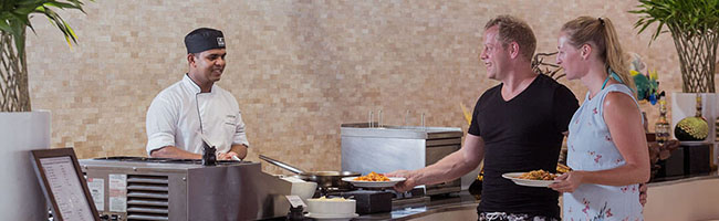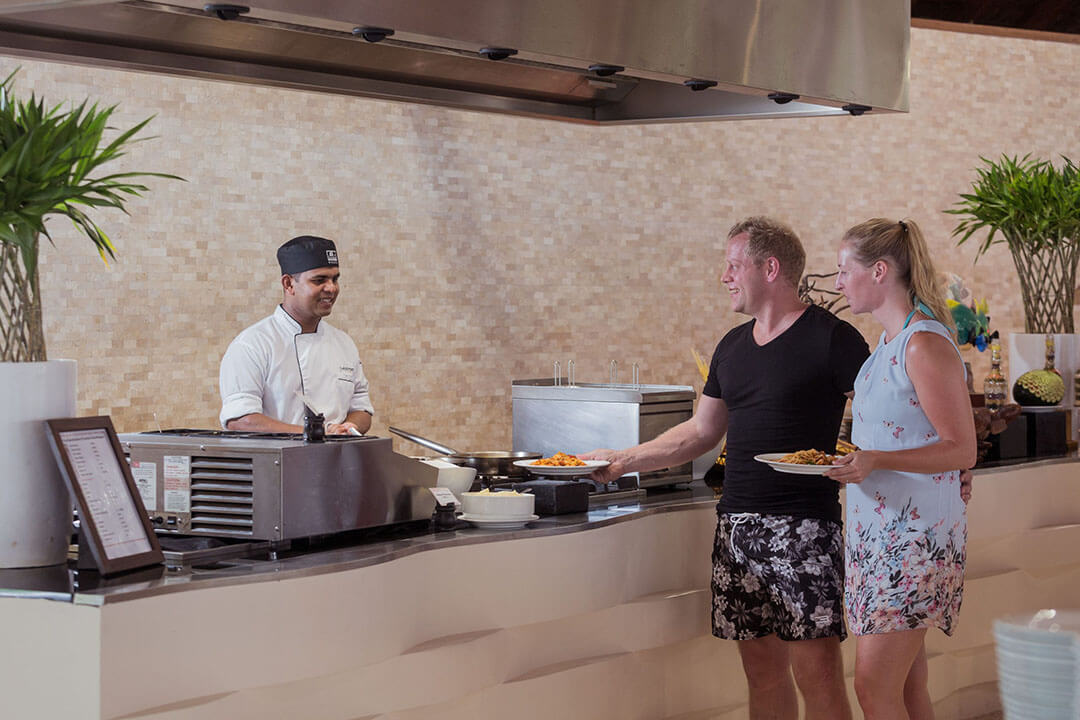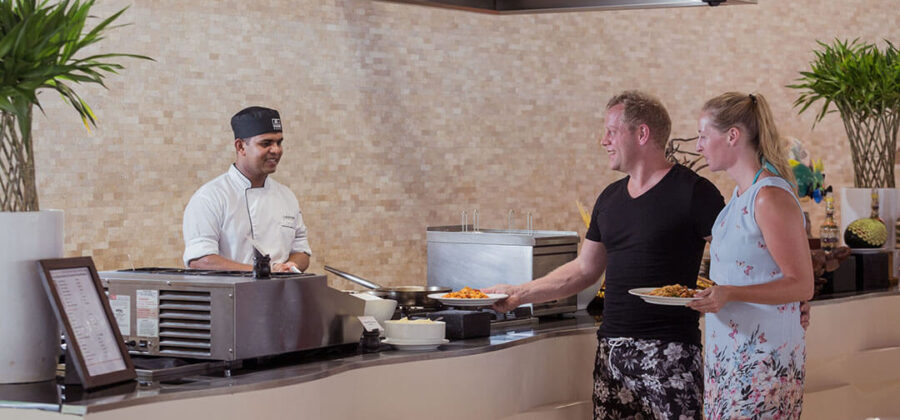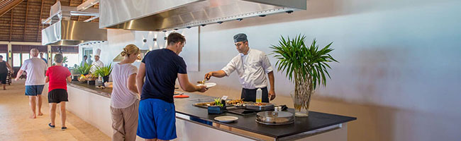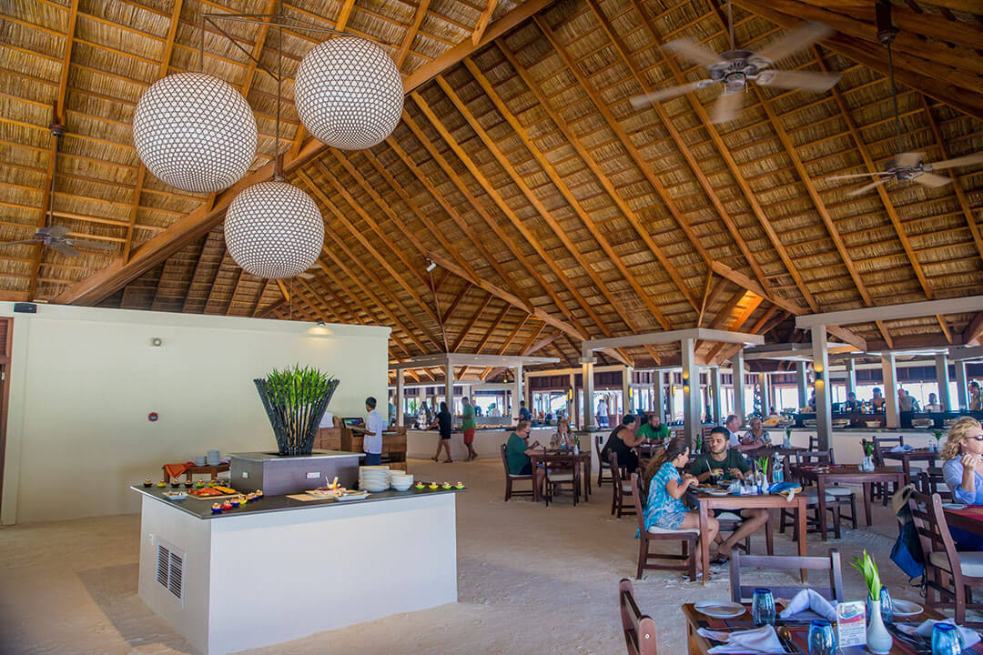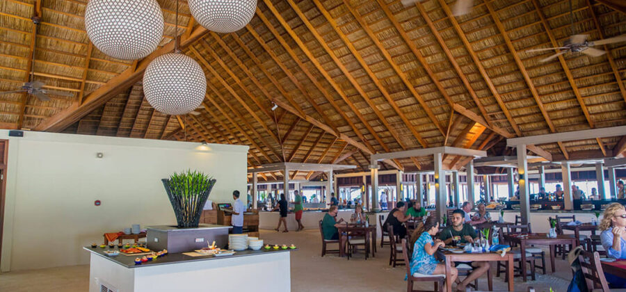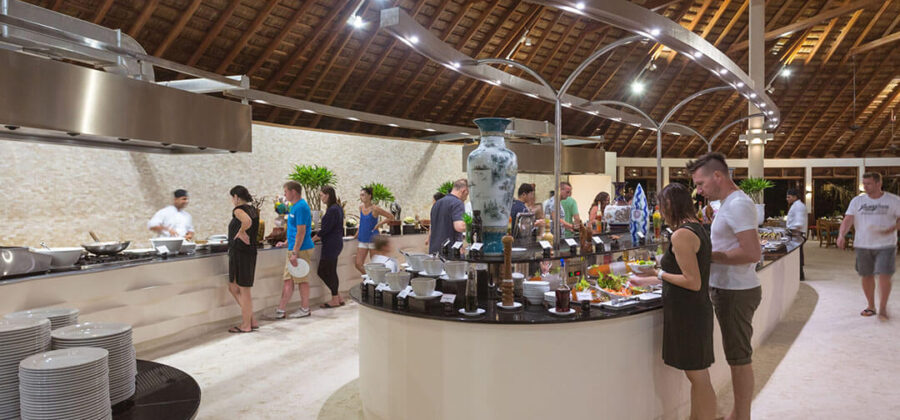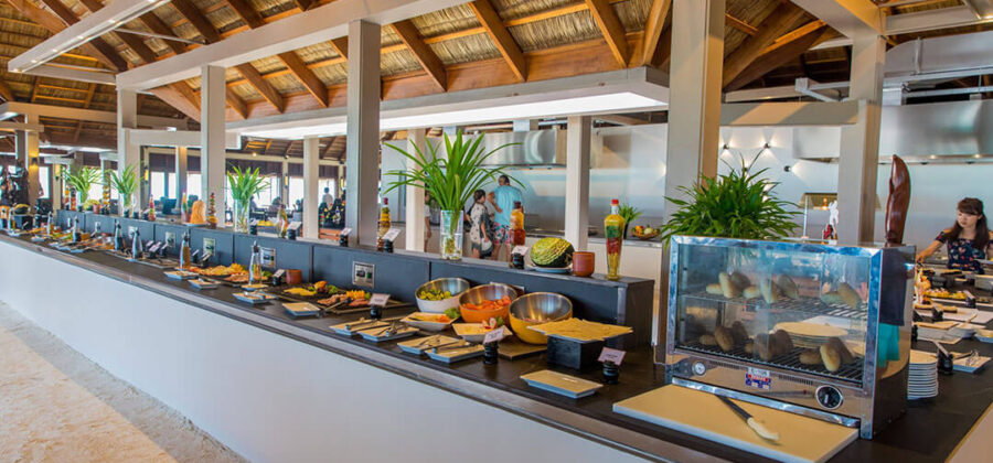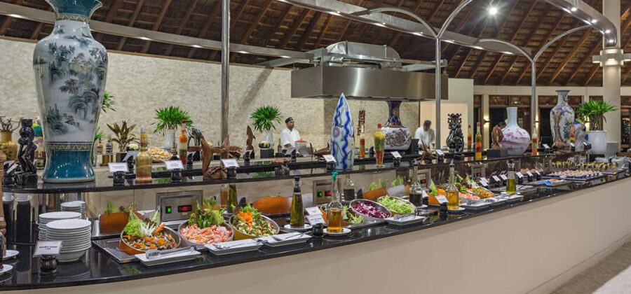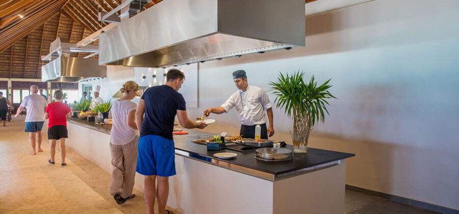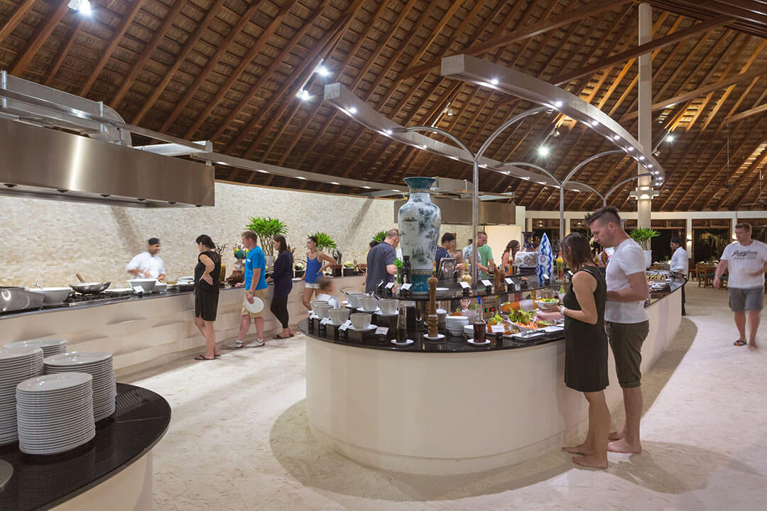 Als Verpflegungsvarianten kannst Du Dich hier im Meeru für Vollpension, Meeru Island Resort All Inclusive und Meeru Island Resort All Inclusive Plus entscheiden. Bei den beiden All-Inclusive-Varianten sind jegliche Getränke und Snacks für zwischendurch natürlich im Preis schon enthalten. Für die normalen Mahlzeiten stehen zwei Hauptrestaurants zur Verfügung. In beiden wird exakt das gleiche Büffet serviert. Die Restaurants sind den verschiedenen Unterkünften zugewiesen, sodass sich schon bei Deiner Buchung entscheidet, in welchem Restaurant des Meeru Malediven Du Dein Frühstück, Mittag- und Abendessen zu Dir nimmst. Wer keine Lust auf die Hauptrestaurants hat, hat natürlich auch die Möglichkeit, den Zimmer-Service zu nutzen und in seiner Unterkunft zu speisen.