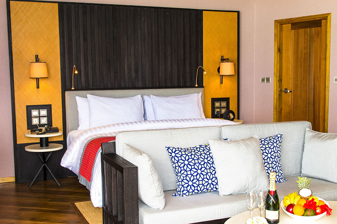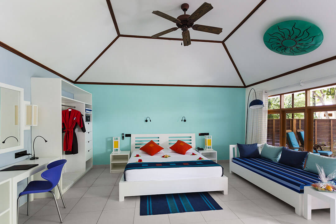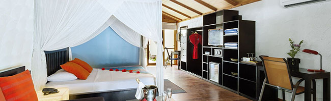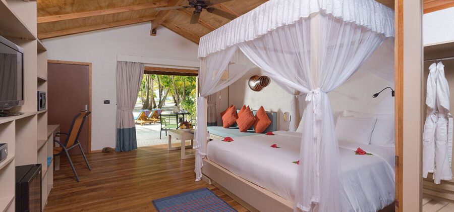 Diese Standardeinrichtung ist gleichzeitig auch die Einrichtung der 20 Garten Zimmer, die in U-Form rund um den traumhaften und großen Swimming Pool des Meeru Island Resorts & Spa angelegt sind. 50 qm sind diese Zimmer groß und haben damit für Hotelzimmer schon eine beachtliche Größe. Aber das ist eben oftmals Standard auf den Malediven. Gleiches gilt dabei auch für den Komfort in den einzelnen Zimmerkategorien. Ein großes und sehr komfortables King-Size-Bett rundet die Einrichtung der Zimmer wunderbar ab.