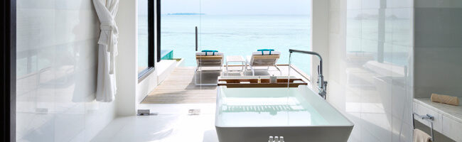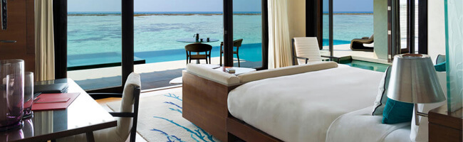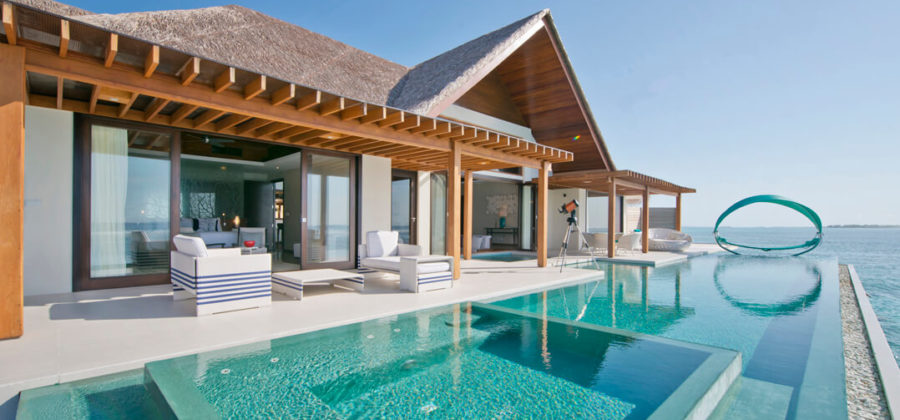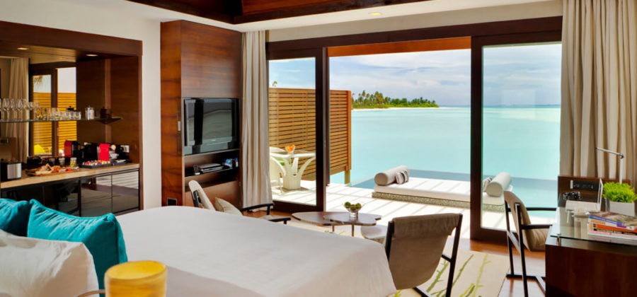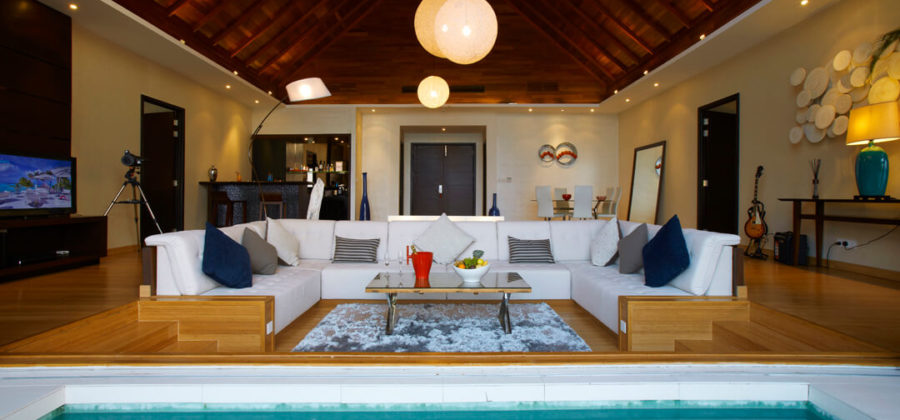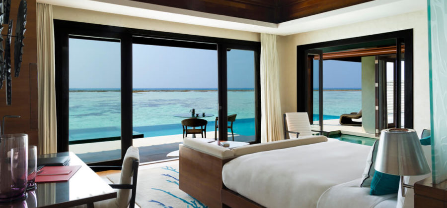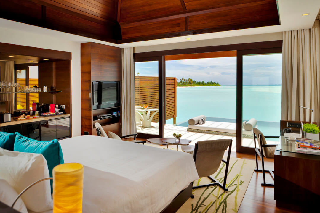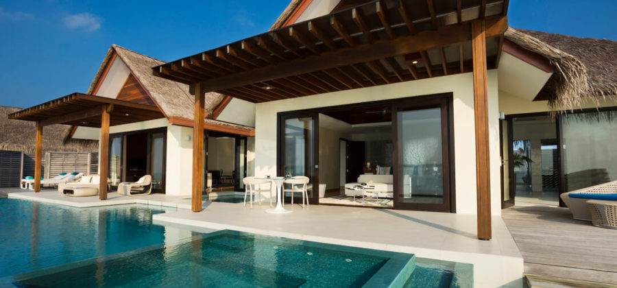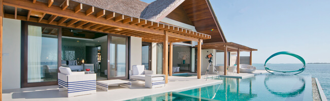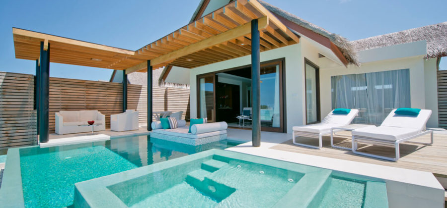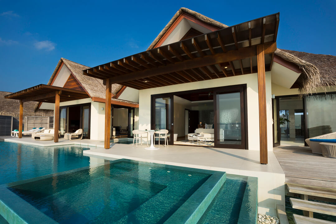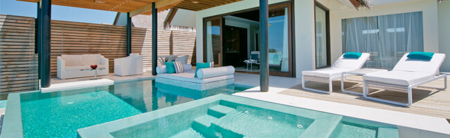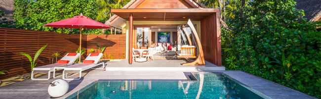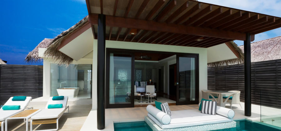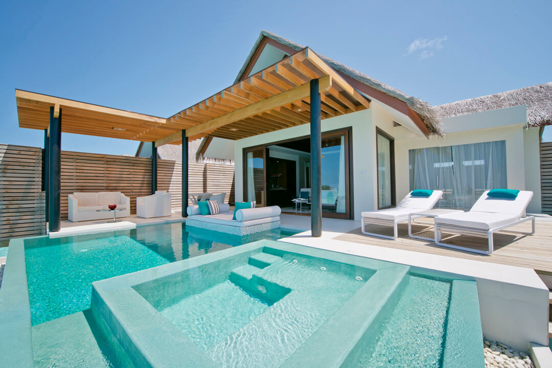 Als wahrer Hingucker entpuppt sich dieser besondere Water Pavillon. Auf insgesamt 340 qm verteilt, findest Du hier alles, was Dein Herz begehren könnte. Ein Infinity-Pool auf der privaten Terrasse, ein Outdoor-Jacuzzi, ein luxuriöses Badezimmer und ein geräumiges Schlafzimmer mit King-Size-Bett befördern die Gäste dieser Unterkunft in den Luxushimmel und sorgen für Wohlfühlmomente der Extraklasse. Solltest Du Dich tatsächlich für eine Unterkunft in dem Water Pavillon mit einem Schlafzimmer und Pool entscheiden, profitierst Du von einer besonderen Geste des Resorts: Demnach darfst Du Dich jeden Tag an einem Präsentkorb gefüllt mit frischen Kokosnüssen und gekühlten Tüchern zur Erfrischung Deiner Haut erfreuen.