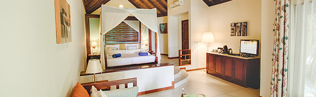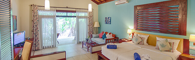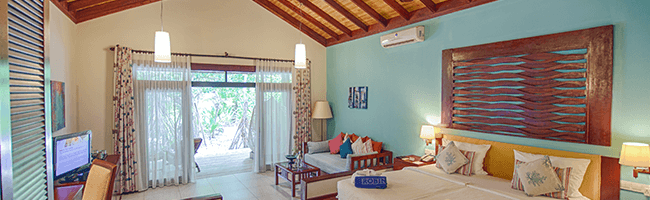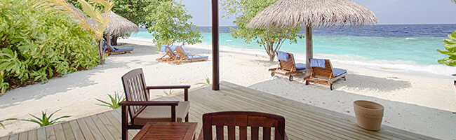 Natürlich bietet der ROBINSON CLUB MALDIVES auch einen Strandbungalow mit Meerblick und Strandnähe an. In unmittelbarer Strandlage besitzt dieser Bungalow eine Größe von rund 71 qm und bietet daher also eindeutig mehr Raum zur persönlichen Entfaltung. Die bessere Lage des Bungalows macht sich vor allem beim Ausblick bemerkbar. Ansonsten sind Raumaufteilung und Einrichtung weitgehend identisch mit dem Economy Bungalow, nur dass die Möbel dieser Zimmerkategorie etwas hochwertiger, moderner und aufwendiger gestaltet wirken.