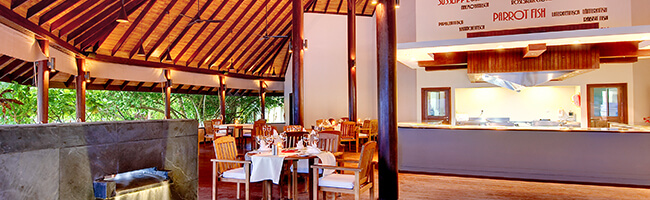 Im Hauptrestaurant des ROBINSON CLUB MALDIVES werden innerhalb eines Büffets internationale Speisen dargereicht. Das Ambiente des Restaurants ist modern und gepflegt. In Sachen Kleidung wird um angemessene Kleidung gebeten, wenn diese auch durchaus leger sein darf. Männer sollten also lange Hosen und angemessene Oberteile, bevorzugt Freizeithemden, tragen. Frauen machen hier mit einem Kleid oder einem Rock mit passendem Oberteil die beste Figur bei den Mahlzeiten. Um das richtige Feeling aufkommen zu lassen, können Gäste übrigens barfuß zum Essen kommen, da der Boden mit Sand ausgestattet ist.