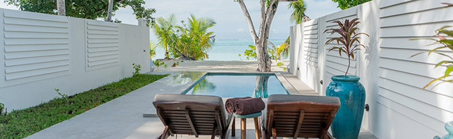 Erlebe Ruhe und Privatsphäre auf 121 Quadratmeter, mit offenem Wohnbereich, Terrasse und Privatpool. Entspanne dich in der Beach Pool Villa mit direktem Zugang zum Meer und genieße den Blick von der Villa zum Meer und in die Palmen.
