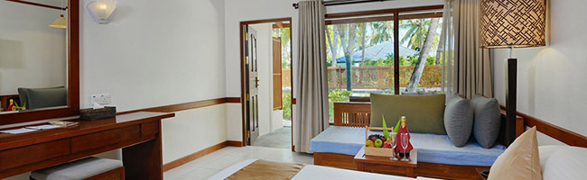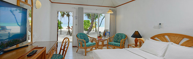 Die Deluxe Beach Villa des Sun Island Resort Malediven befindet sich wie auch die anderen Unterkünfte in unmittelbarer Nähe zum Strand und ermöglicht einen tollen Blick auf das azurblaue Meer. Mit einer Größe von 53 Quadratmeter bietet diese Form der Unterkunft bereits ausreichend Raum für Dich, Deine Reisebegleitung und Euer Gepäck. Der Fußboden ist vorwiegend mit Fliesen ausgelegt. Der Fliesenboden sorgt dafür, dass der Bungalow angenehm kühl bleibt und trägt zur Optik positiv bei. Ansonsten sind in diese Villen alle Ausstattungsaspekte der Standardeinrichtung zu finden.