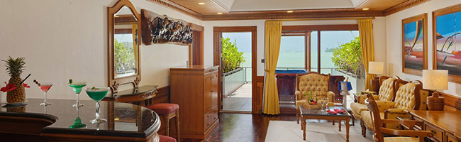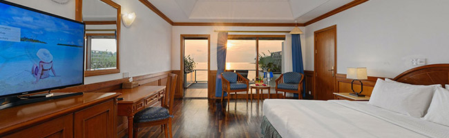 Die Two Bedroom Overwater Suite verkörpert die luxuriöseste Unterkunftsform des Sun Island Maledives. Sie befindet sich zwar ebenso wie der Water Bungalow über dem Wasser, dennoch überzeugt die Suite mit vielen luxuriösen Extras wie einem Wohnzimmer, einer Jacuzzi-Badewanne, 2 Schlafzimmern und einer eigenen Bar mit Barhockern. Auch die Möglichkeit, unter freiem Himmel auf der privaten Terrasse zu dinieren, ist hier gegeben.